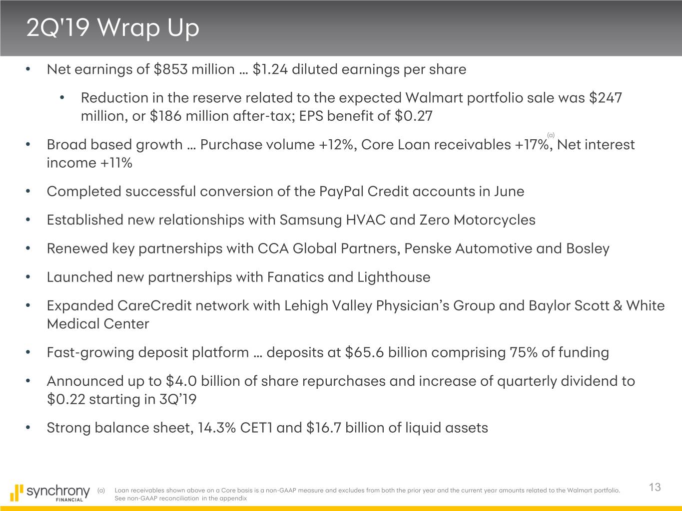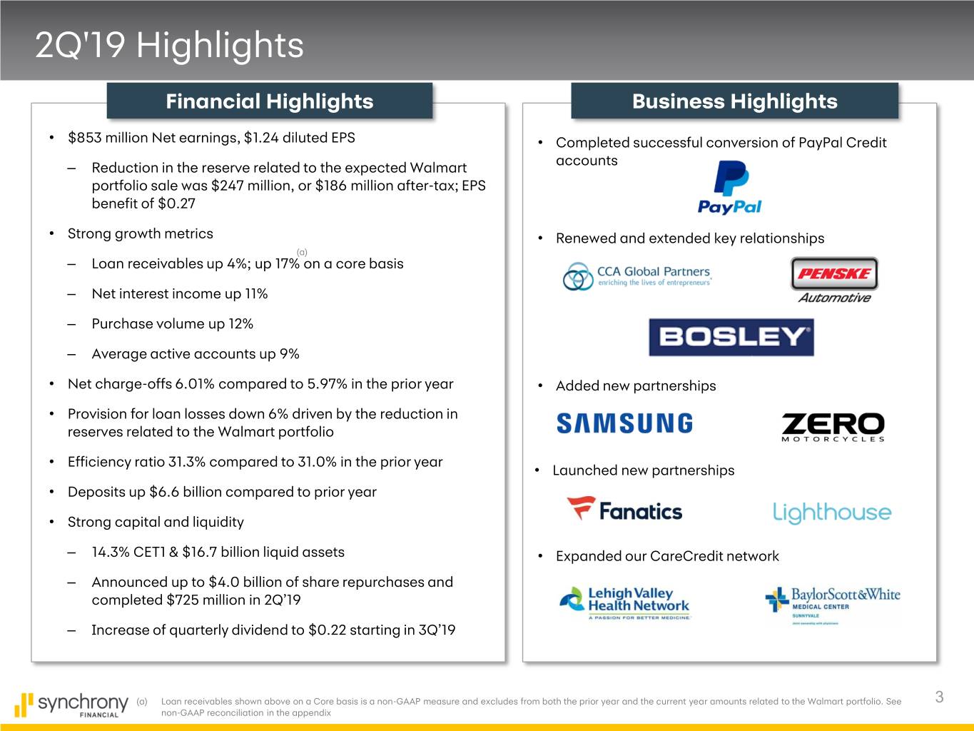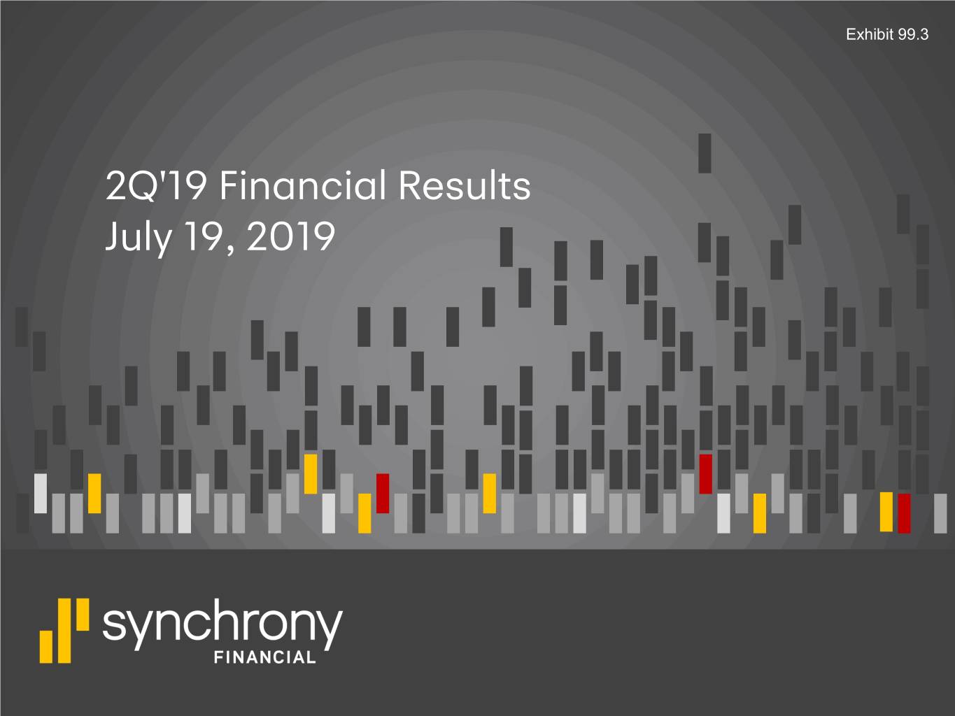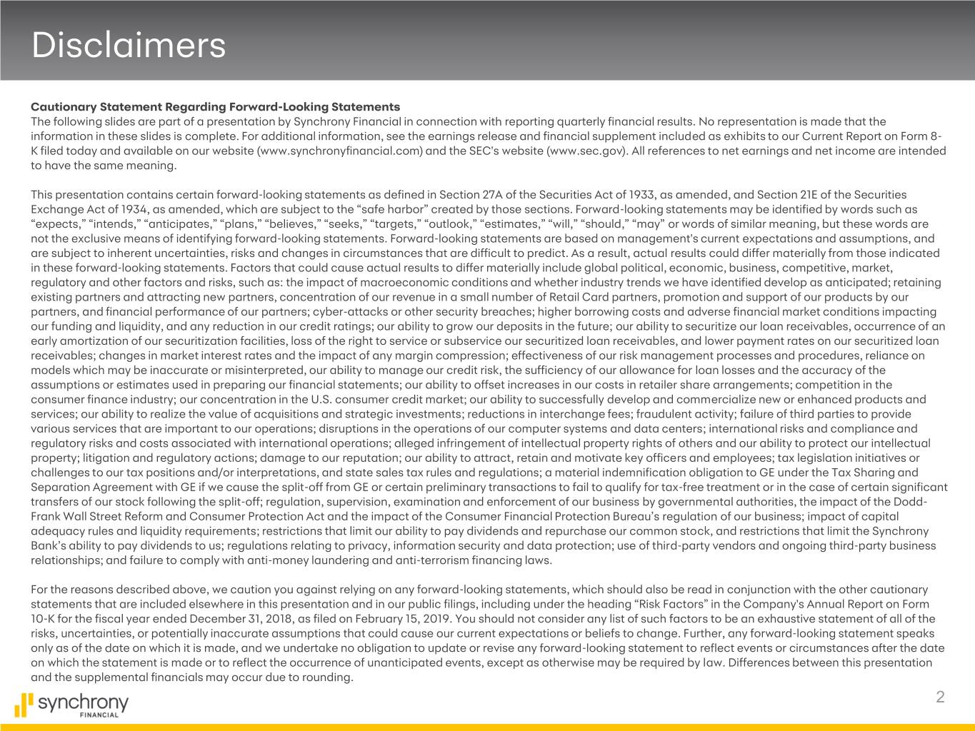 Disclaimers Cautionary Statement Regarding Forward-Looking Statements The following slides are part of a presentation by Synchrony Financial in connection with reporting quarterly financial results. No representation is made that the information in these slides is complete. For additional information, see the earnings release and financial supplement included as exhibits to our Current Report on Form 8- K filed today and available on our website (www.synchronyfinancial.com) and the SEC's website (www.sec.gov). All references to net earnings and net income are intended to have the same meaning. This presentation contains certain forward-looking statements as defined in Section 27A of the Securities Act of 1933, as amended, and Section 21E of the Securities Exchange Act of 1934, as amended, which are subject to the “safe harbor” created by those sections. Forward-looking statements may be identified by words such as “expects,” “intends,” “anticipates,” “plans,” “believes,” “seeks,” “targets,” “outlook,” “estimates,” “will,” “should,” “may” or words of similar meaning, but these words are not the exclusive means of identifying forward-looking statements. Forward-looking statements are based on management's current expectations and assumptions, and are subject to inherent uncertainties, risks and changes in circumstances that are difficult to predict. As a result, actual results could differ materially from those indicated in these forward-looking statements. Factors that could cause actual results to differ materially include global political, economic, business, competitive, market, regulatory and other factors and risks, such as: the impact of macroeconomic conditions and whether industry trends we have identified develop as anticipated; retaining existing partners and attracting new partners, concentration of our revenue in a small number of Retail Card partners, promotion and support of our products by our partners, and financial performance of our partners; cyber-attacks or other security breaches; higher borrowing costs and adverse financial market conditions impacting our funding and liquidity, and any reduction in our credit ratings; our ability to grow our deposits in the future; our ability to securitize our loan receivables, occurrence of an early amortization of our securitization facilities, loss of the right to service or subservice our securitized loan receivables, and lower payment rates on our securitized loan receivables; changes in market interest rates and the impact of any margin compression; effectiveness of our risk management processes and procedures, reliance on models which may be inaccurate or misinterpreted, our ability to manage our credit risk, the sufficiency of our allowance for loan losses and the accuracy of the assumptions or estimates used in preparing our financial statements; our ability to offset increases in our costs in retailer share arrangements; competition in the consumer finance industry; our concentration in the U.S. consumer credit market; our ability to successfully develop and commercialize new or enhanced products and services; our ability to realize the value of acquisitions and strategic investments; reductions in interchange fees; fraudulent activity; failure of third parties to provide various services that are important to our operations; disruptions in the operations of our computer systems and data centers; international risks and compliance and regulatory risks and costs associated with international operations; alleged infringement of intellectual property rights of others and our ability to protect our intellectual property; litigation and regulatory actions; damage to our reputation; our ability to attract, retain and motivate key officers and employees; tax legislation initiatives or challenges to our tax positions and/or interpretations, and state sales tax rules and regulations; a material indemnification obligation to GE under the Tax Sharing and Separation Agreement with GE if we cause the split-off from GE or certain preliminary transactions to fail to qualify for tax-free treatment or in the case of certain significant transfers of our stock following the split-off; regulation, supervision, examination and enforcement of our business by governmental authorities, the impact of the Dodd- Frank Wall Street Reform and Consumer Protection Act and the impact of the Consumer Financial Protection Bureau’s regulation of our business; impact of capital adequacy rules and liquidity requirements; restrictions that limit our ability to pay dividends and repurchase our common stock, and restrictions that limit the Synchrony Bank’s ability to pay dividends to us; regulations relating to privacy, information security and data protection; use of third-party vendors and ongoing third-party business relationships; and failure to comply with anti-money laundering and anti-terrorism financing laws. For the reasons described above, we caution you against relying on any forward-looking statements, which should also be read in conjunction with the other cautionary statements that are included elsewhere in this presentation and in our public filings, including under the heading “Risk Factors” in the Company's Annual Report on Form 10-K for the fiscal year ended December 31, 2018, as filed on February 15, 2019. You should not consider any list of such factors to be an exhaustive statement of all of the risks, uncertainties, or potentially inaccurate assumptions that could cause our current expectations or beliefs to change. Further, any forward-looking statement speaks only as of the date on which it is made, and we undertake no obligation to update or revise any forward-looking statement to reflect events or circumstances after the date on which the statement is made or to reflect the occurrence of unanticipated events, except as otherwise may be required by law. Differences between this 