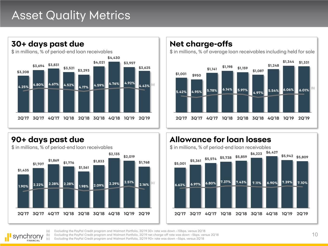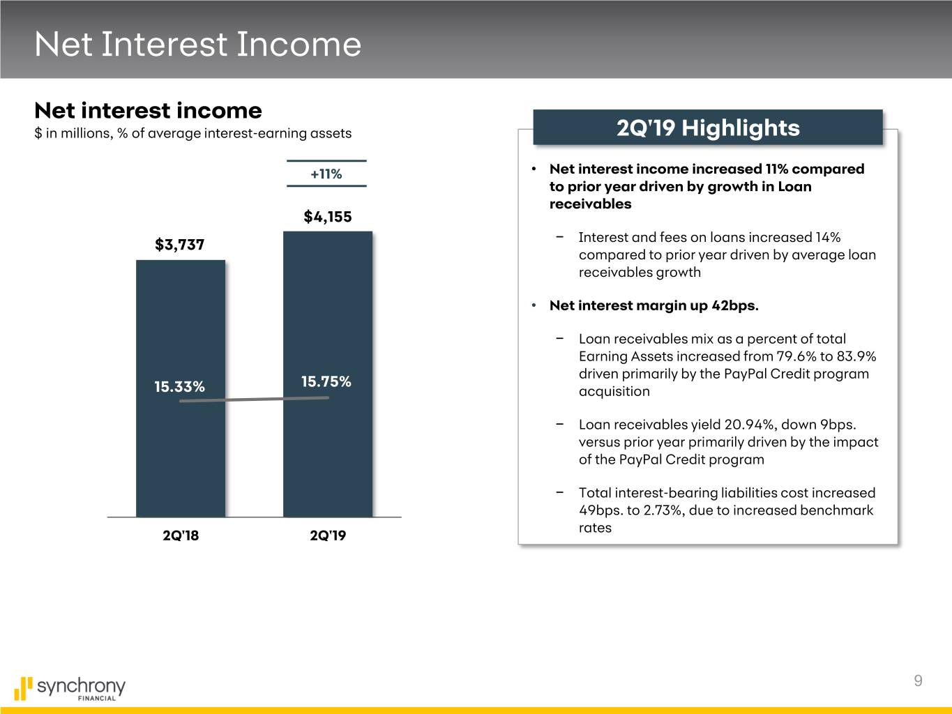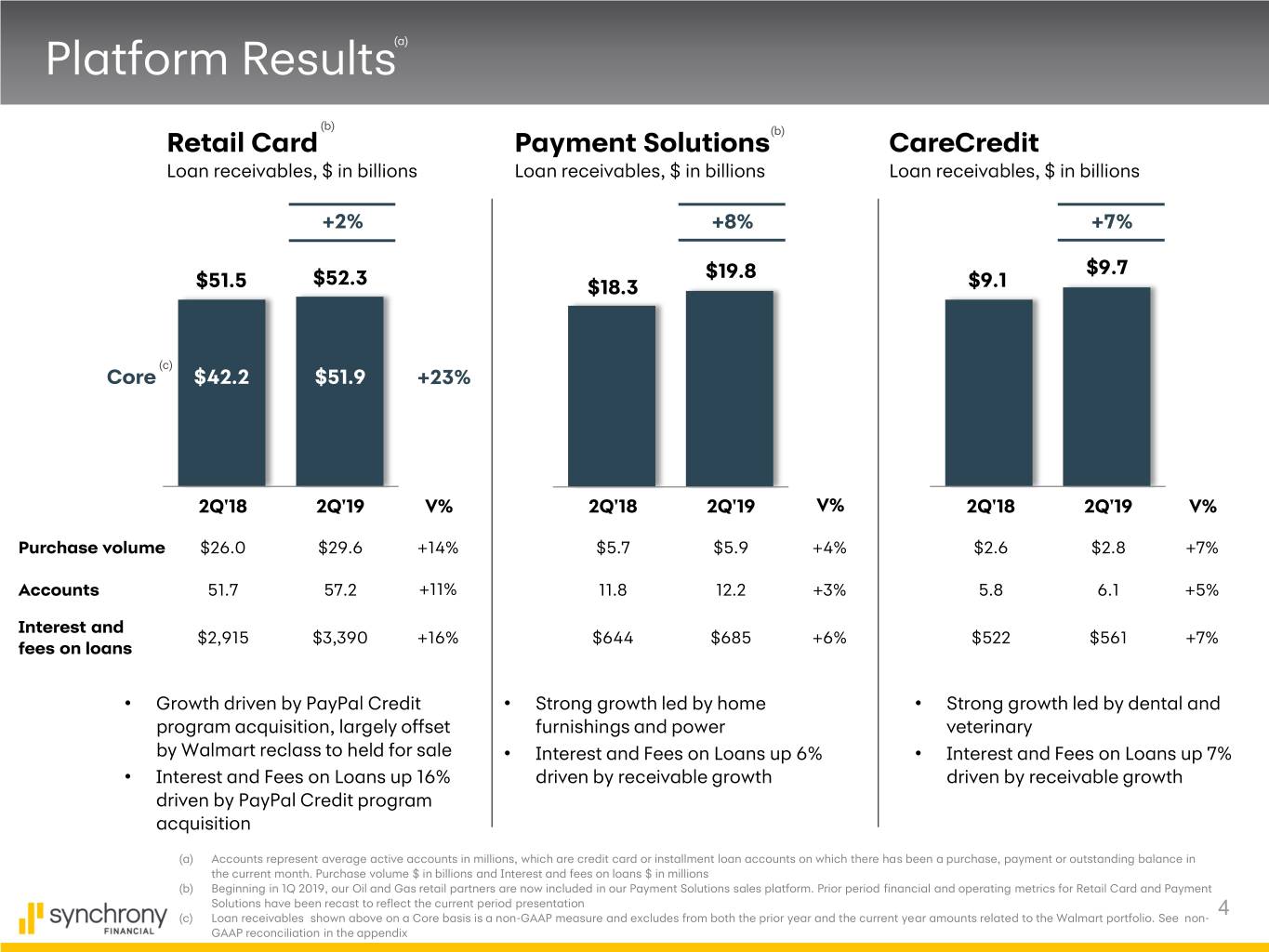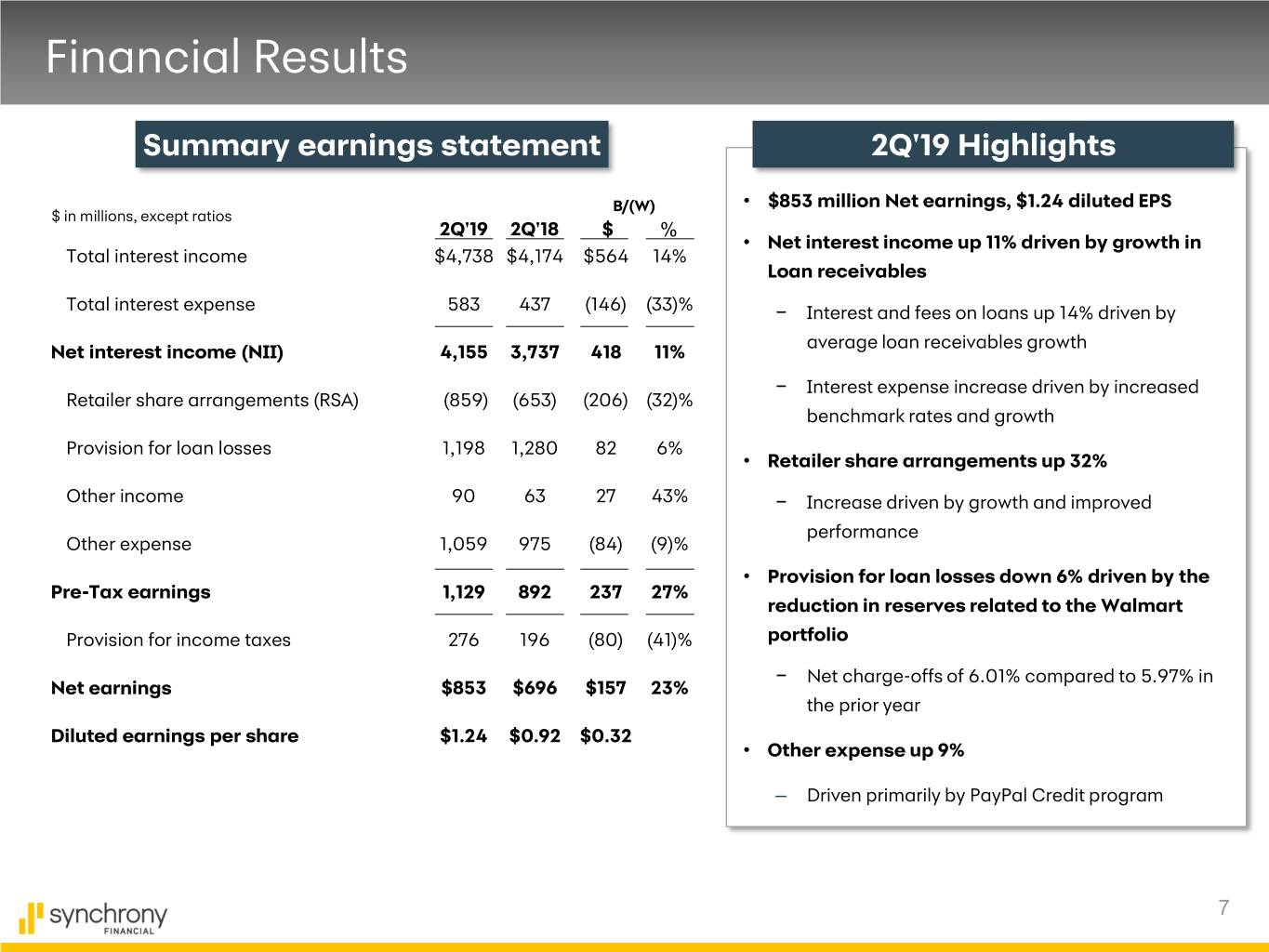 Disclaimers Cautionary Statement Regarding Forward-Looking Statements The following slides are part of a presentation by Synchrony Financial in connection with reporting quarterly financial results. No representation is made that the information in these slides is complete. For additional information, see the earnings release and financial supplement included as exhibits to our Current Report on Form 8- K filed today and available on our website (www.synchronyfinancial.com) and the SEC's website (www.sec.gov). All references to net earnings and net income are intended to have the same meaning. This presentation contains certain forward-looking statements as defined in Section 27A of the Securities Act of 1933, as amended, and Section 21E of the Securities Exchange Act of 1934, as amended, which are subject to the “safe harbor” created by those sections. Forward-looking statements may be identified by words such as “expects,” “intends,” “anticipates,” “plans,” “believes,” “seeks,” “targets,” “outlook,” “estimates,” “will,” “should,” “may” or words of similar meaning, but these words are not the exclusive means of identifying forward-looking statements. Forward-looking statements are based on management's current expectations and assumptions, and are subject to inherent uncertainties, risks and changes in circumstances that are difficult to predict. As a result, actual results could differ materially from those indicated in these forward-looking statements. Factors that could cause actual results to differ materially include global political, economic, business, competitive, market, regulatory and other factors and risks, such as: the impact of macroeconomic conditions and whether industry trends we have identified develop as anticipated; retaining existing partners and attracting new partners, concentration of our revenue in a small number of Retail Card partners, promotion and support of our products by our partners, and financial performance of our partners; cyber-attacks or other security breaches; higher borrowing costs and adverse financial market conditions impacting our funding and liquidity, and any reduction in our credit ratings; our ability to grow our deposits in the future; our ability to securitize our loan receivables, occurrence of an early amortization of our securitization facilities, loss of the right to service or subservice our securitized loan receivables, and lower payment rates on our securitized loan receivables; changes in market interest rates and the impact of any margin compression; effectiveness of our risk management processes and procedures, reliance on models which may be inaccurate or misinterpreted, our ability to manage our credit risk, the sufficiency of our allowance for loan losses and the accuracy of the assumptions or estimates used in preparing our financial statements; our ability to offset increases in our costs in retailer share arrangements; competition in the consumer finance industry; our concentration in the U.S. consumer credit market; our ability to successfully develop and commercialize new or enhanced products and services; our ability to realize the value of acquisitions and strategic investments; reductions in interchange fees; fraudulent activity; failure of third parties to provide various services that are important to our operations; disruptions in the operations of our computer systems and data centers; international risks and compliance and regulatory risks and costs associated with international operations; alleged infringement of intellectual property rights of others and our ability to protect our intellectual property; litigation and regulatory actions; damage to our reputation; our ability to attract, retain and motivate key officers and employees; tax legislation initiatives or challenges to our tax positions and/or interpretations, and state sales tax rules and regulations; a material indemnification obligation to GE under the Tax Sharing and Separation Agreement with GE if we cause the split-off from GE or certain preliminary transactions to fail to qualify for tax-free treatment or in the case of certain significant transfers of our stock following the split-off; regulation, supervision, examination and enforcement of our business by governmental authorities, the impact of the Dodd- Frank Wall Street Reform and Consumer Protection Act and the impact of the Consumer Financial Protection Bureau’s regulation of our business; impact of capital adequacy rules and liquidity requirements; restrictions that limit our ability to pay dividends and repurchase our common stock, and restrictions that limit the Synchrony Bank’s ability to pay dividends to us; regulations relating to privacy, information security and data protection; use of third-party vendors and ongoing third-party business relationships; and failure to comply with anti-money laundering and anti-terrorism financing laws. For the reasons described above, we caution you against relying on any forward-looking statements, which should also be read in conjunction with the other cautionary statements that are included elsewhere in this presentation and in our public filings, including under the heading “Risk Factors” in the Company's Annual Report on Form 10-K for the fiscal year ended December 31, 2018, as filed on February 15, 2019. You should not consider any list of such factors to be an exhaustive statement of all of the risks, uncertainties, or potentially inaccurate assumptions that could cause our current expectations or beliefs to change. Further, any forward-looking statement speaks only as of the date on which it is made, and we undertake no obligation to update or revise any forward-looking statement to reflect events or circumstances after the date on which the statement is made or to reflect the occurrence of unanticipated events, except as otherwise may be required by law. Differences between this 