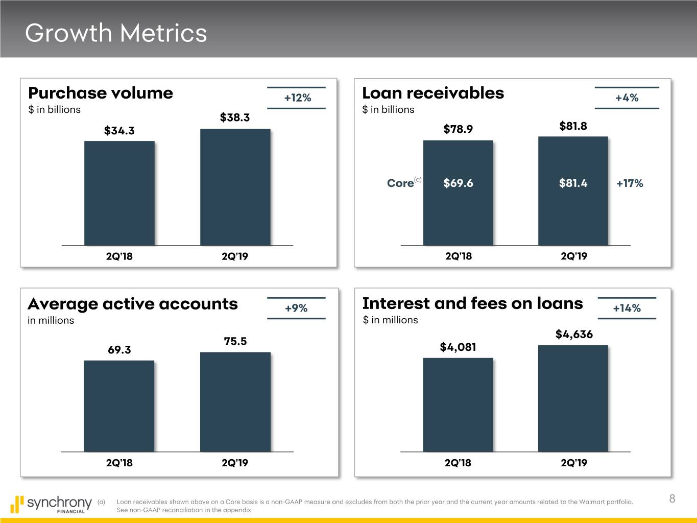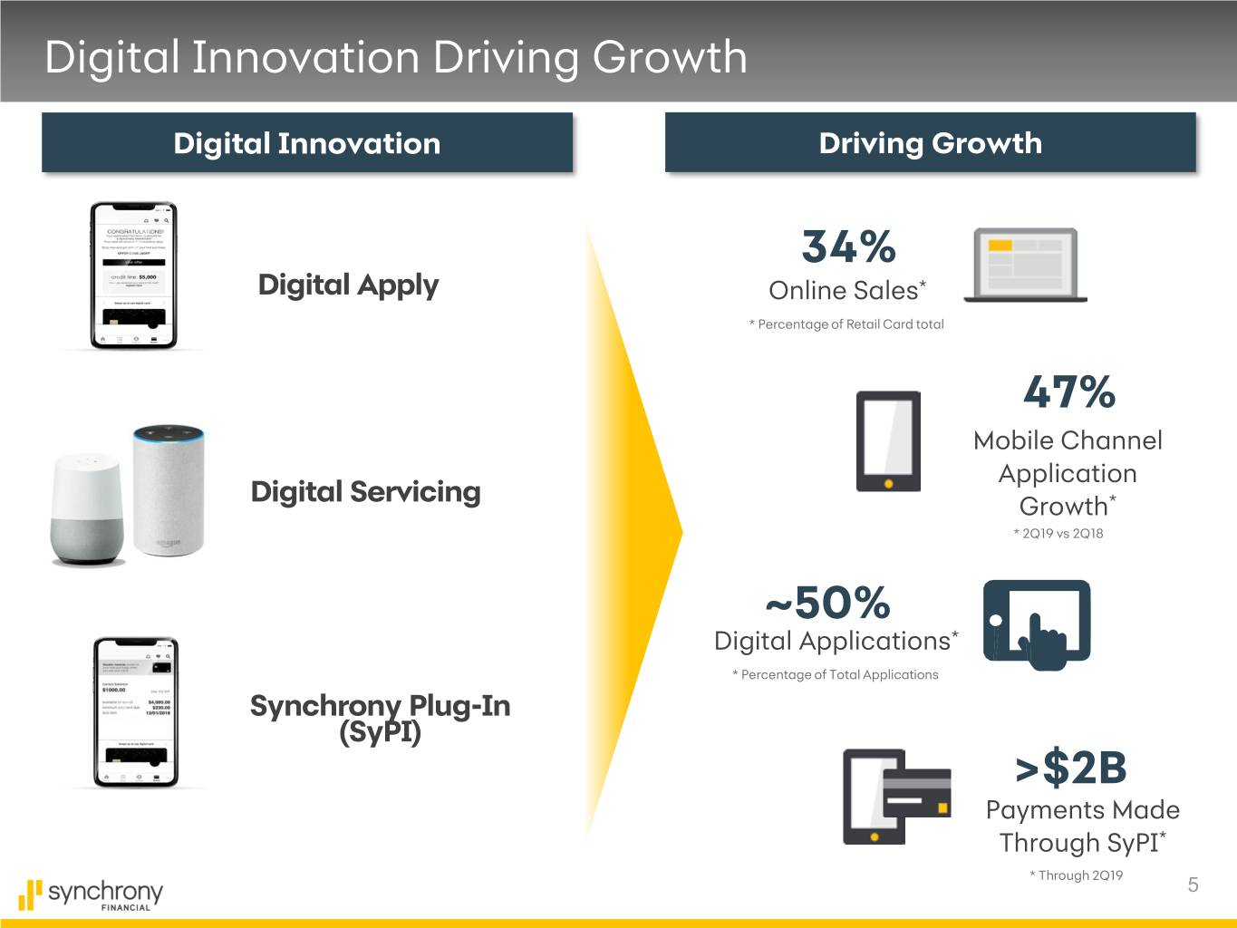 Digital Innovation Driving Growth Digital Innovation Driving Growth 34% Digital Apply Online Sales* * Percentage of Retail Card total 47% Mobile Channel Application Digital Servicing Growth* * 2Q19 vs 2Q18 ~50% Digital Applications* * Percentage of Total Applications Synchrony Plug-In (SyPI) >$2B Payments Made Through SyPI* * Through 2Q19 5