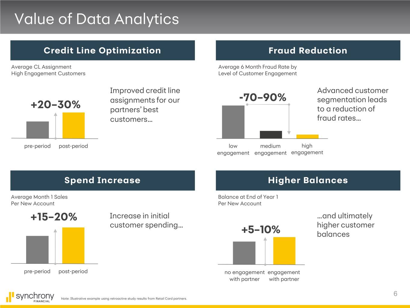 Value of Data Analytics Credit Line Optimization Fraud Reduction Average CL Assignment Average 6 Month Fraud Rate by High Engagement Customers Level of Customer Engagement Improved credit line Advanced customer assignments for our -70–90% segmentation leads +20–30% partners’ best to a reduction of customers… fraud rates… pre-period post-period low medium high engagement engagement engagement Spend Increase Higher Balances Average Month 1 Sales Balance at End of Year 1 Per New Account Per New Account +15–20% Increase in initial …and ultimately customer spending… higher customer +5–10% balances pre-period post-period no engagement engagement with partner with partner 6 Note: Illustrative example using retroactive study results from Retail Card partners.