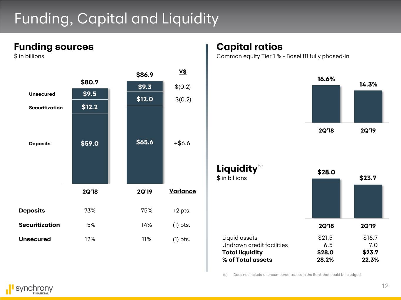 Funding, Capital and Liquidity Funding sources Capital ratios $ in billions Common equity Tier 1 % - Basel III fully phased-in $86.9 V$ $80.7 16.6% $9.3 $(0.2) 14.3% Unsecured $9.5 $12.0 $(0.2) Securitization $12.2 2Q'18 2Q'19 Deposits $59.0 $65.6 +$6.6 (a) Liquidity $28.0 $ in billions $23.7 2Q'18 2Q'19 Variance Deposits 73% 75% +2 pts. Securitization 15% 14% (1) pts. 2Q'18 2Q'19 Unsecured 12% 11% (1) pts. Liquid assets $21.5 $16.7 Undrawn credit facilities 6.5 7.0 Total liquidity $28.0 $23.7 % of Total assets 28.2% 22.3% (a) Does not include unencumbered assets in the Bank that could be pledged 12