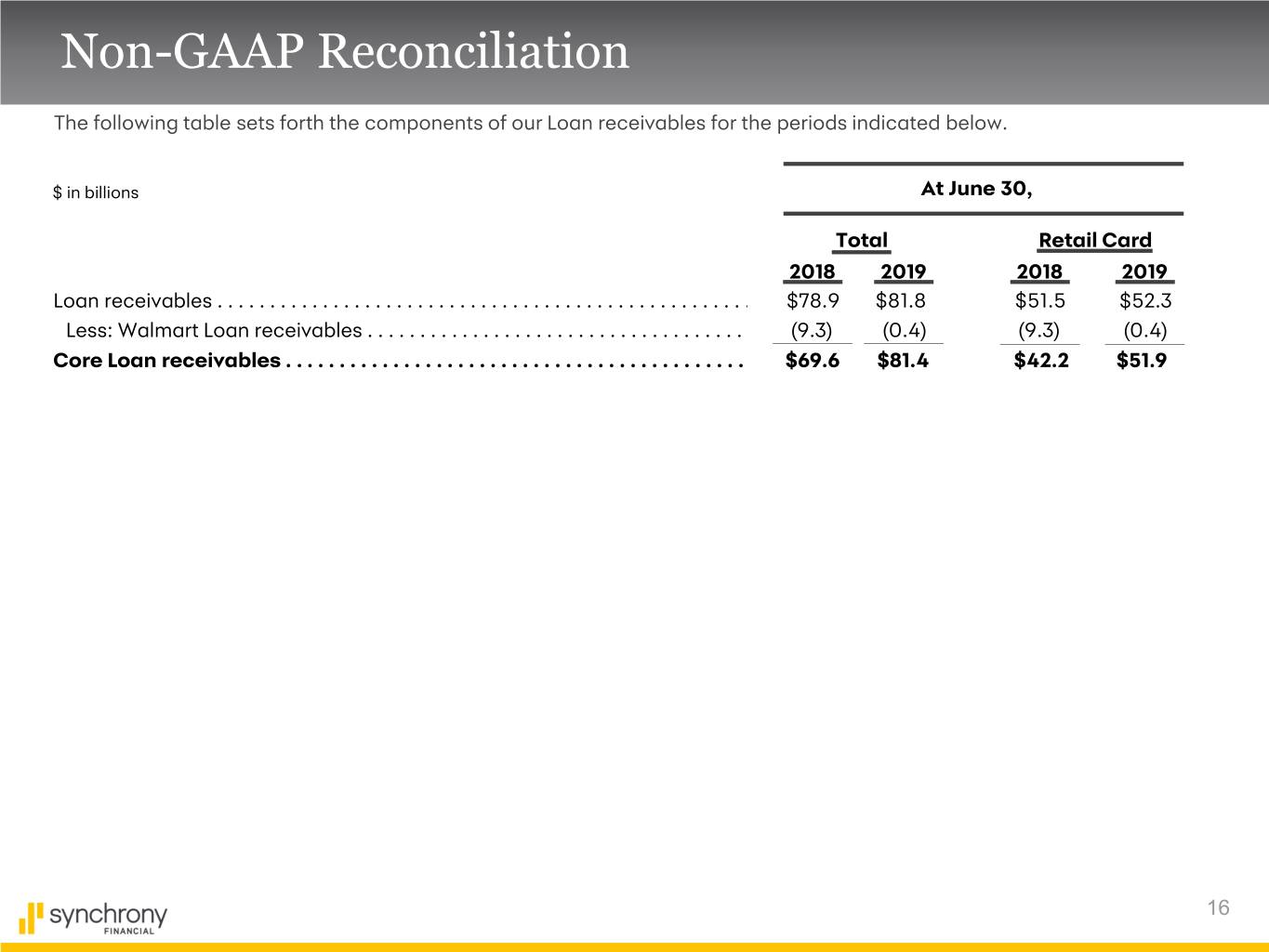 Non-GAAP Reconciliation The following table sets forth the components of our Loan receivables for the periods indicated below. $ in billions At June 30, Total Retail Card 2018 2019 2018 2019 Loan receivables . . . . . . . . . . . . . . . . . . . . . . . . . . . . . . . . . . . . . . . . . . . . . . . . . . . $78.9 $81.8 $51.5 $52.3 Less: Walmart Loan receivables . . . . . . . . . . . . . . . . . . . . . . . . . . . . . . . . . . . . . (9.3) (0.4) (9.3) (0.4) Core Loan receivables . . . . . . . . . . . . . . . . . . . . . . . . . . . . . . . . . . . . . . . . . . . . $69.6 $81.4 $42.2 $51.9 16
