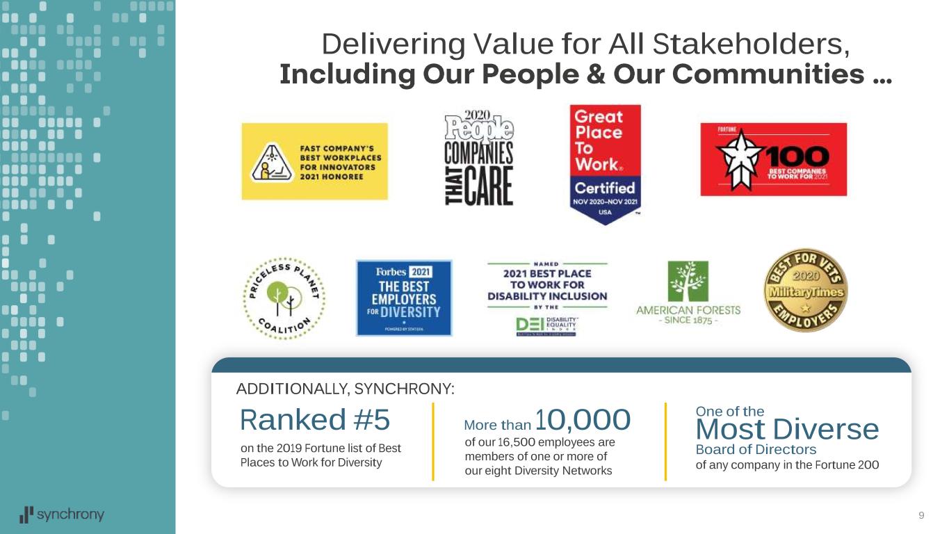 9 Delivering Value for All Stakeholders, ADDITIONALLY, SYNCHRONY: One of the Board of Directors of any company in the Fortune 200 on the 2019 Fortune list of Best Places to Work for Diversity Ranked #5 of our 16,500 employees are members of one or more of our eight Diversity Networks More than 10,000 Most Diverse