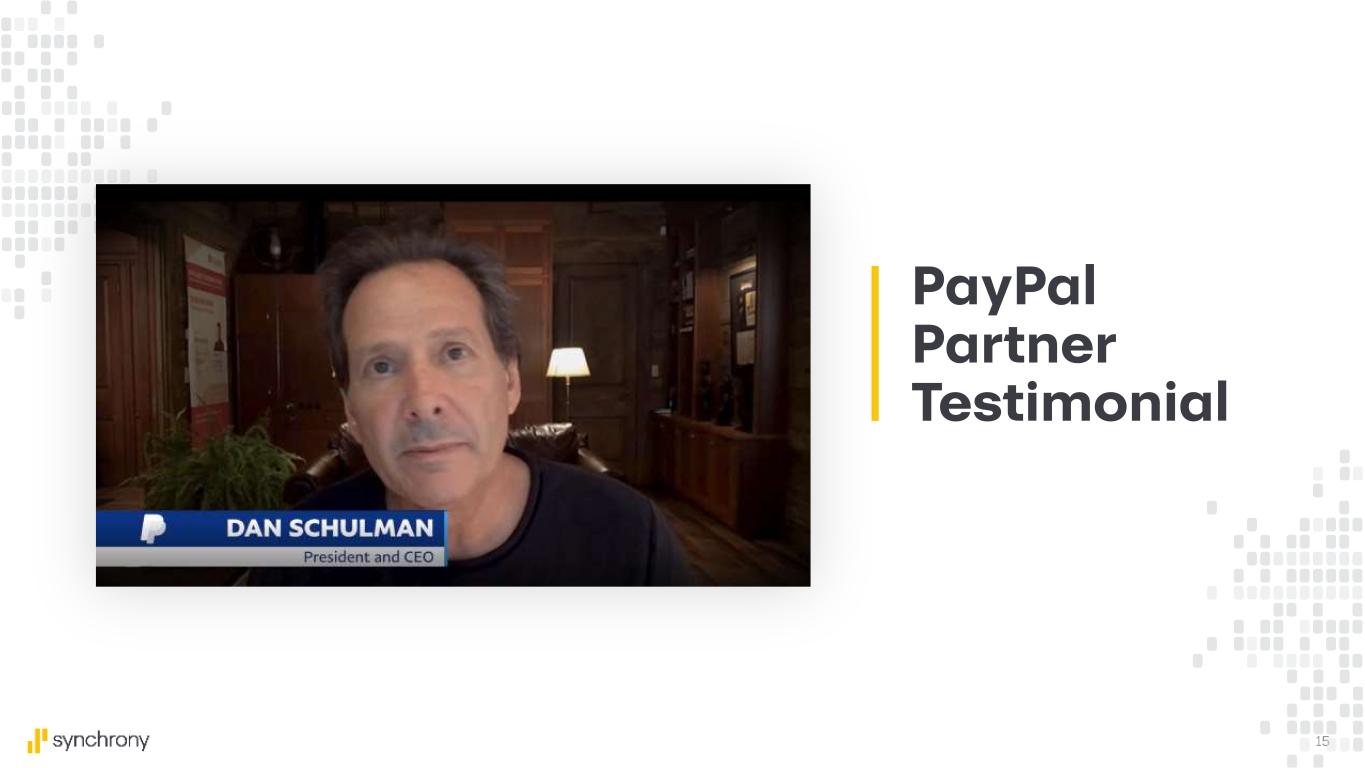 14 Partners and Customers are at the Forefront of Every Product & Service We Offer Customer Choice Purchasing Power Frictionless, Digital CX Value Prop Experience & Trust Seamless Customer Journey APPLY USE SERVICEENGAGE Multi-product Suite Digital Bank BNPL/Installments Growth Adjacencies PLCC DUAL CARD CO-BRAND SECURED NETWORK SYNCHRONY MC PET INSURANCE HEALTH SYSTEMS GIFTNOW INSTALLMENTS & LEASING INSTALLMENTS & BNPL SYNCHRONY NETWORKS & MARKETPLACE SECURED Revolving Commercial BUSINESS REVOLVING CREDIT INVOICE-BASED HIGH YIELD SAVINGS CD IRA MONEY MARKET