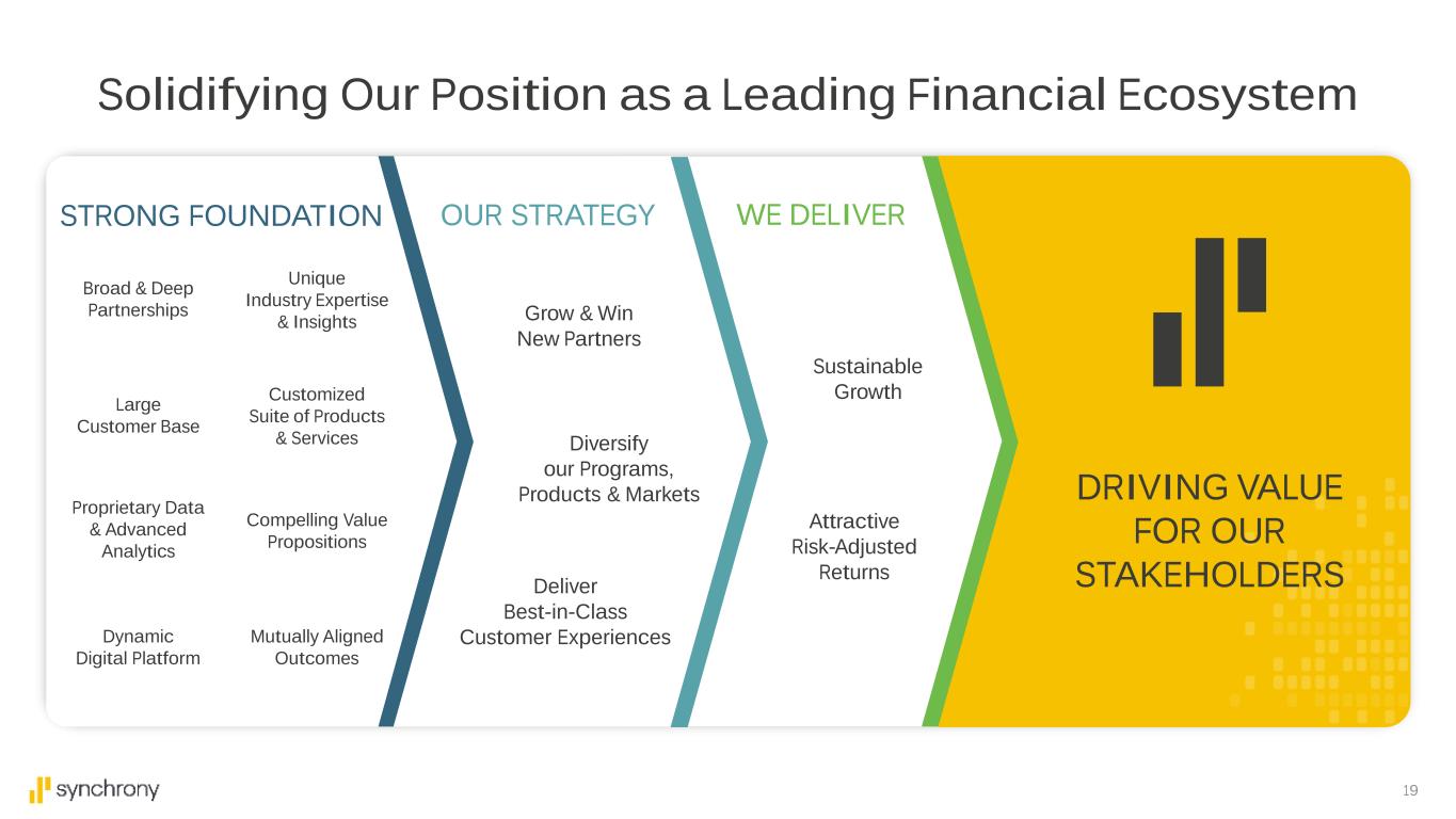 18 Seamless Customer Experiences through Our Proprietary Products, Strategic Investments and Acquisitions AGILE INVESTMENT TECH INVESTMENTCLOUDINNOVATION STATION PROPRIETARY PRODUCTS & CAPABILITIES BUILD developer SyPI Attribute Data Share Synchrony Enterprise Data Lake ENGAGE 100 API ENDPOINTS Synchrony Plug-In ACQUISITIONS STRATEGIC INVESTMENTS & PARTNERSHIPS