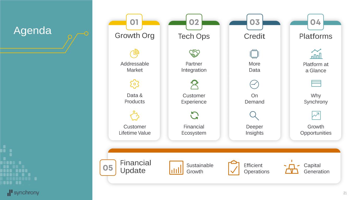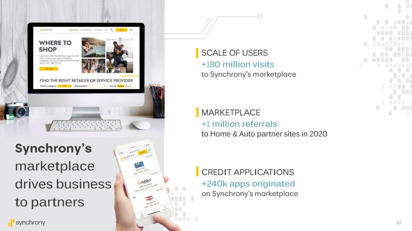 3 Cautionary Statement Regarding Forward-Looking Statements This presentation contains certain forward-looking statements as defined in Section 27A of the Securities Act of 1933, as amended, and Section 21E of the Securities Exchange Act of 1934, as amended, which are subject to the "safe harbor" created by those sections. Forward-looking statements may be identified by words such as "expects," "intends," "anticipates," "plans," "believes," "seeks," "targets," "outlook," "estimates," "will," "should," "may" or words of similar meaning, but these words are not the exclusive means of identifying forward-looking statements. Forward-looking statements are based on management's current expectations and assumptions, and are subject to inherent uncertainties, risks and changes in circumstances that are difficult to predict. As a result, actual results could differ materially from those indicated in these forward-looking statements. Factors that could cause actual results to differ materially include global political, economic, business, competitive, market, regulatory and other factors and risks, such as: the impact of macroeconomic conditions and whether industry trends we have identified develop as anticipated, including the future impacts of the novel coronavirus - icult to predict; retaining existing partners and attracting new partners, concentration of our revenue in a small number of partners, and promotion and support of our products by our partners; cyber-attacks or other security breaches; disruptions in the operations of our and our outsourced partners' computer systems and data centers; the financial performance of our partners; the sufficiency of our allowance for credit losses and the accuracy of the assumptions or estimates used in preparing our financial statements, including those related to the CECL accounting guidance; higher borrowing costs and adverse financial market conditions impacting our funding and liquidity, and any reduction in our credit ratings; our ability to grow our deposits in the future; damage to our reputation; our ability to securitize our loan receivables, occurrence of an early amortization of our securitization facilities, loss of the right to service or subservice our securitized loan receivables, and lower payment rates on our securitized loan receivables; changes in market interest rates and the impact of any margin compression; effectiveness of our risk management processes and procedures, reliance on models which may be inaccurate or misinterpreted, our ability to manage our credit risk; our ability to offset increases in our costs in retailer share arrangements; competition in the consumer finance industry; our concentration in the U.S. consumer credit market; our ability to successfully develop and commercialize new or enhanced products and services; our ability to realize the value of acquisitions and strategic investments; reductions in interchange fees; fraudulent activity; failure of third-parties to provide various services that are important to our operations; international risks and compliance and regulatory risks and costs associated with international operations; alleged infringement of intellectual property rights of others and our ability to protect our intellectual property; litigation and regulatory actions; our ability to attract, retain and motivate key officers and employees; tax legislation initiatives or challenges to our tax positions and/or interpretations, and state sales tax rules and regulations; regulation, supervision, examination and enforcement of our business by governmental authorities, the impact of the Dodd-Frank Wall - t of the Consumer Financial Protection hat limit our ability to pay dividends and repurchase our tion security and data protection; use of third-party vendors and ongoing third-party business relationships; and failure to comply with anti-money laundering and anti-terrorism financing laws. For the reasons described above, we caution you against relying on any forward-looking statements, which should also be read in conjunction with the other cautionary Ris Annual Report on Form 10-K for the fiscal year ended December 31, 2020, as filed on February 11, 2021. You should not consider any list of such factors to be an exhaustive statement of all the risks, uncertainties, or potentially inaccurate assumptions that could cause our current expectations or beliefs to change. Further, any forward-looking statement speaks only as of the date on which it is made, and we undertake no obligation to update or revise any forward-looking statement to reflect events or circumstances after the date on which the statement is made or to reflect the occurrence of unanticipated events, except as otherwise may be required by law. This presentation contains various statistical and other data relating to current and future market sizes and growth opportuniti which Synchrony operates. These data were sourced from third parties and also Synchrony internal analysis and involve a number of assumptions and estimates. Although we believe the information sourced from third parties to be reliable, we have not independently verified such information and cannot guarantee its accuracy or completeness. -in" capital measures, which are not prepared in accordance with U.S. generally accepted accounting principles ("GAAP"). The reconciliations of such measures to the most directly comparable GAAP measures are included at the end of this presentation. Disclaimers