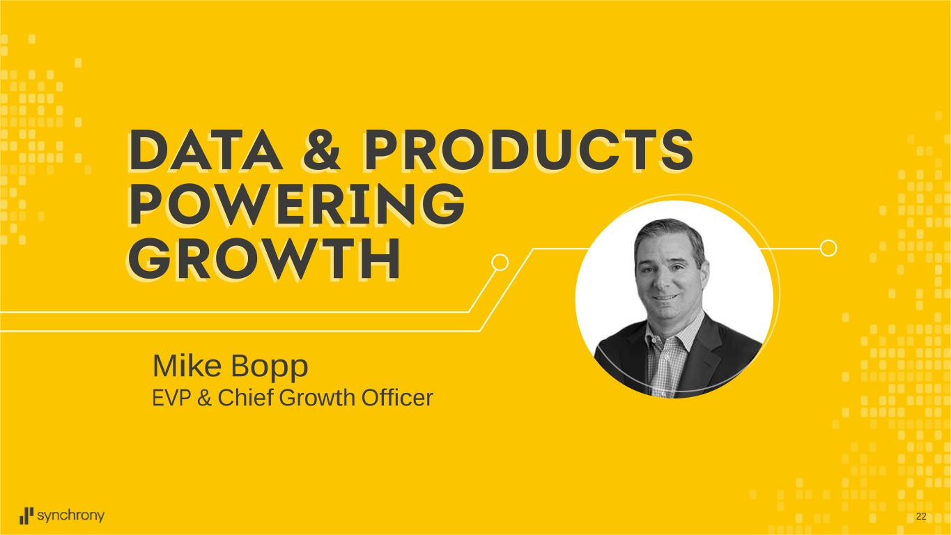 21 Agenda Addressable Market Growth Org Data & Products Customer Lifetime Value Financial Update Sustainable Growth Capital Generation Efficient Operations Partner Integration Tech Ops Customer Experience Financial Ecosystem More Data Credit On Demand Deeper Insights Platform at a Glance Platforms Why Synchrony Growth Opportunities