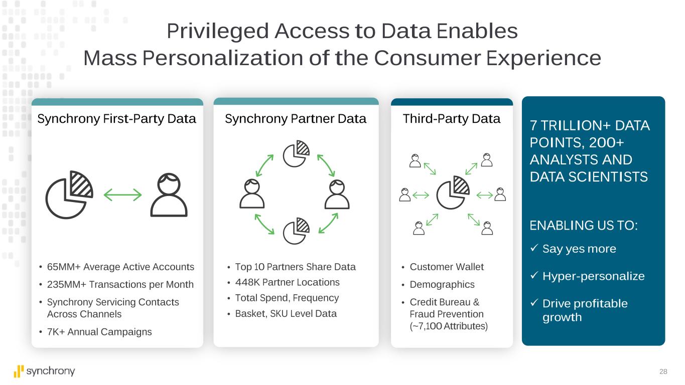 28 Synchrony First-Party Data Synchrony Partner Data • 65MM+ Average Active Accounts • 235MM+ Transactions per Month • Synchrony Servicing Contacts Across Channels • 7K+ Annual Campaigns Top 10 Partners Share Data 448K Partner Locations Total Spend, Frequency Basket, SKU Level Data 7 TRILLION+ DATA POINTS, 200+ ANALYSTS AND DATA SCIENTISTS ENABLING US TO: ✓ Say yes more ✓ Hyper-personalize ✓ Drive profitable growth Third-Party Data Customer Wallet Demographics Credit Bureau & Fraud Prevention (~7,100 Attributes) Privileged Access to Data Enables Mass Personalization of the Consumer Experience