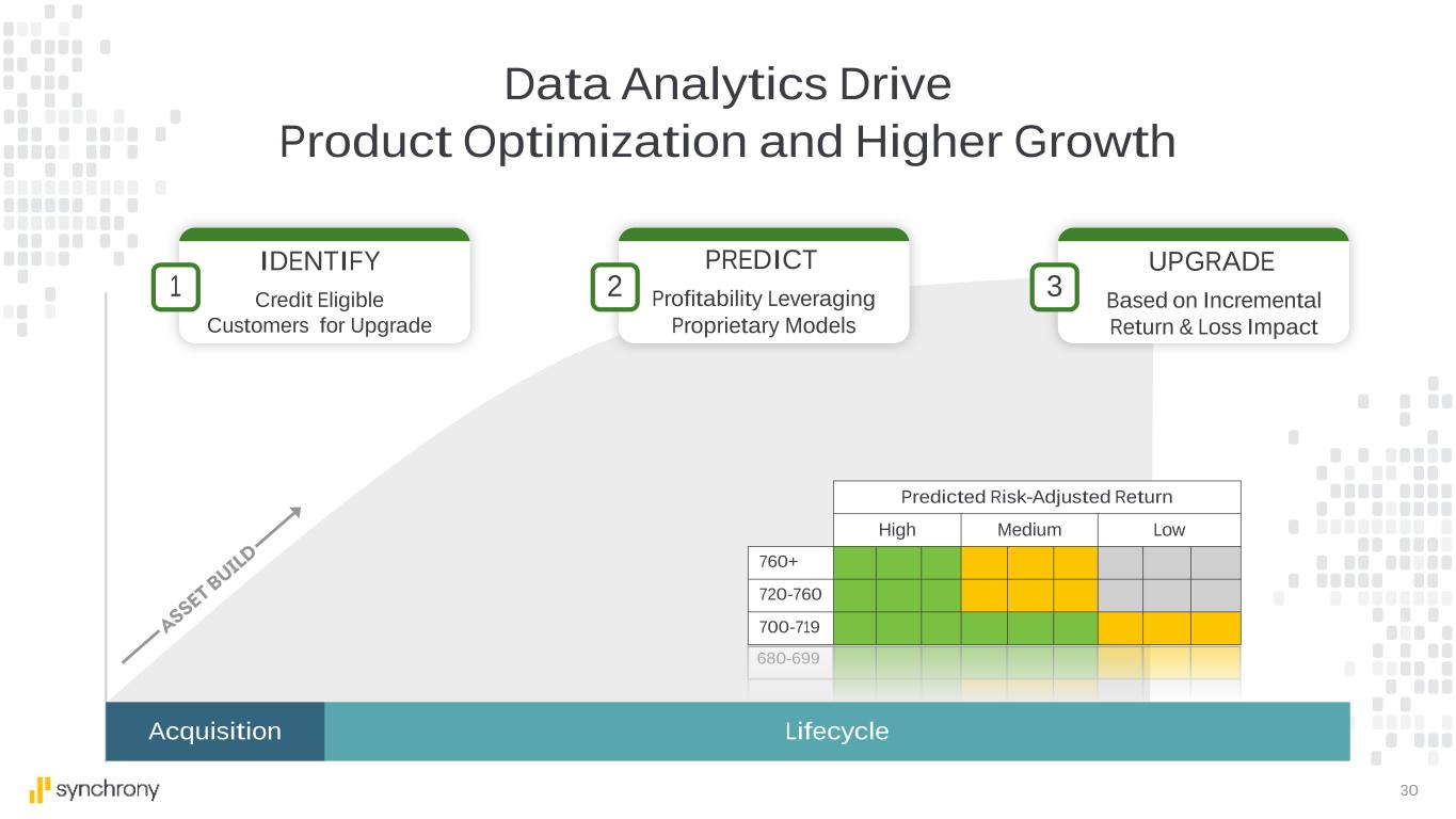29 CREDIT LINE OPTIMIZATION Average Credit Line Assignment +20 to 30% Post-Data Share Pre-Data Share PURCHASE VOLUME INCREASE Average Month 1 Sales/New Account Post-Data Share Pre-Data Share +15 to 20% Data-Sharing Ecosystem Drives Growth and Expands Access Across Our Partner Network Improved credit line best consumers Increase in initial consumer spending 512 data elements of Synchrony active accounts1 and growing! ~75% covering