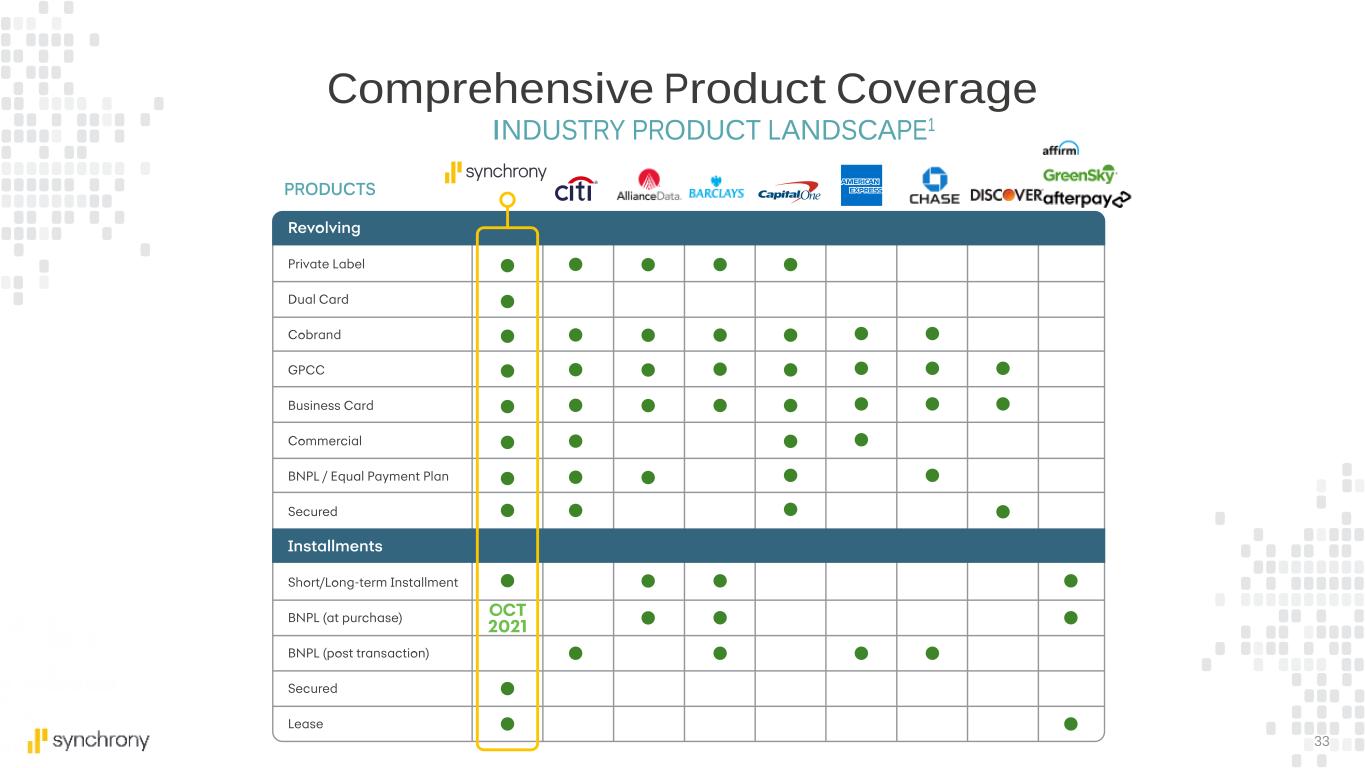 32 QR CODE INSTALLMENTS & BNPL GIFTNOW HEALTH SYSTEMS PET INSURANCE Revolving PAYMENT INTEGRATIONS SECURED Installments Growth Adjacencies POSCLIENT WALLET 3RD-PARTY WALLET APIS PLCC DUAL CARD CO-BRAND SECURED NETWORK SYNCHRONY MC COMMON PLATFORMS Comprehensive Product Set Powered by Scalable Tech Business BUSINESS REVOLVING COMMERCIAL ACCOUNT DIGITAL ACQUISITIONS NATIVE PLUG-IN DIGITAL SERVICING DIGITAL MARKETINGREWARDS INSTALLMENTS & LEASING