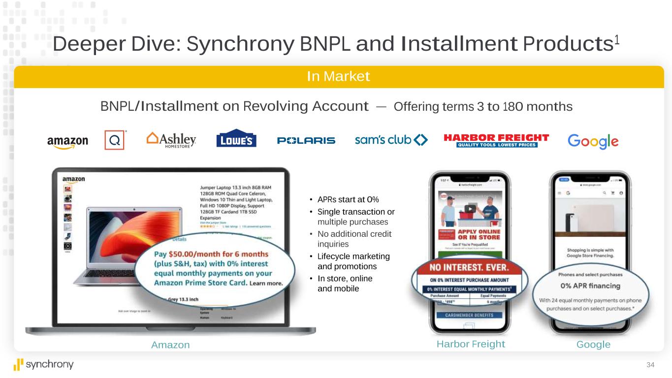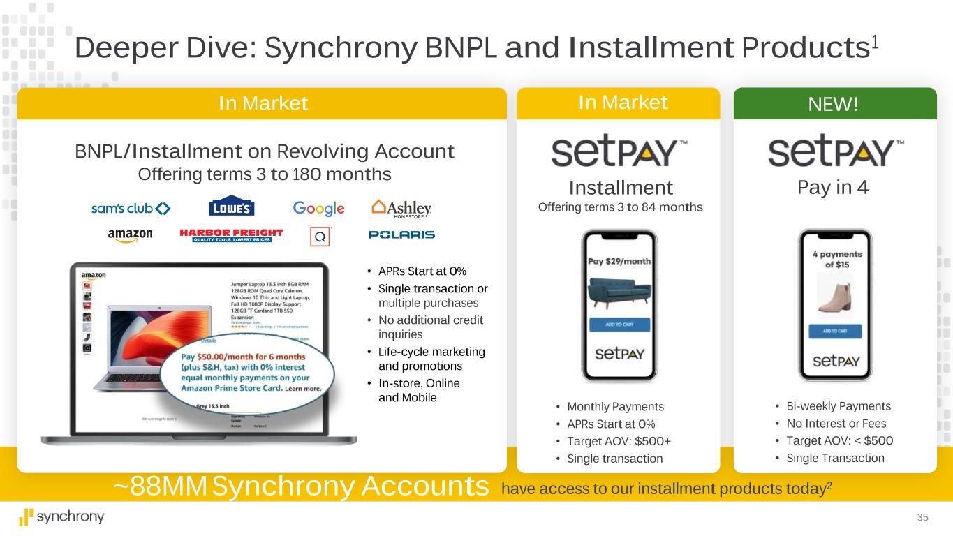 34 • APRs start at 0% • Single transaction or multiple purchases • No additional credit inquiries • Lifecycle marketing and promotions • In store, online and mobile BNPL/Installment on Revolving Account Offering terms 3 to 180 months In Market Deeper Dive: Synchrony BNPL and Installment Products1 Amazon Harbor Freight Google