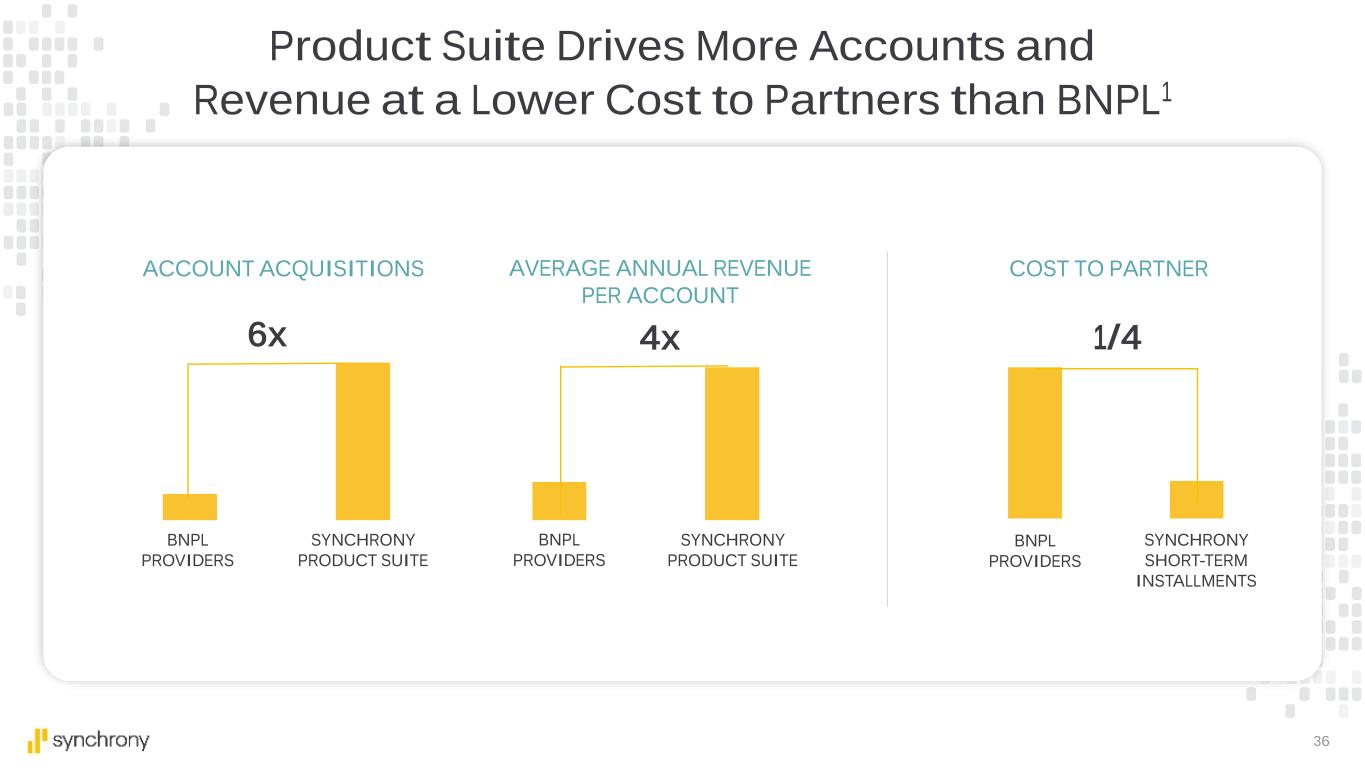 35 BNPL/Installment on Revolving Account Offering terms 3 to 180 months In Market • APRs Start at 0% • Single transaction or multiple purchases • No additional credit inquiries • Life-cycle marketing and promotions • In-store, Online and Mobile In Market Installment Offering terms 3 to 84 months • Monthly Payments • APRs Start at 0% • Target AOV: $500+ • Single transaction Pay in 4 NEW! • Bi-weekly Payments • No Interest or Fees • Target AOV: < $500 • Single Transaction ~88MM Synchrony Accounts have access to our installment products today2 Deeper Dive: Synchrony BNPL and Installment Products1