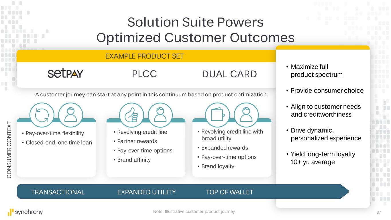 36 1/4 COST TO PARTNERACCOUNT ACQUISITIONS AVERAGE ANNUAL REVENUE PER ACCOUNT 6x 4x SYNCHRONY PRODUCT SUITE SYNCHRONY PRODUCT SUITE SYNCHRONY SHORT-TERM INSTALLMENTS Product Suite Drives More Accounts and Revenue at a Lower Cost to Partners than BNPL1 BNPL PROVIDERS BNPL PROVIDERS BNPL PROVIDERS