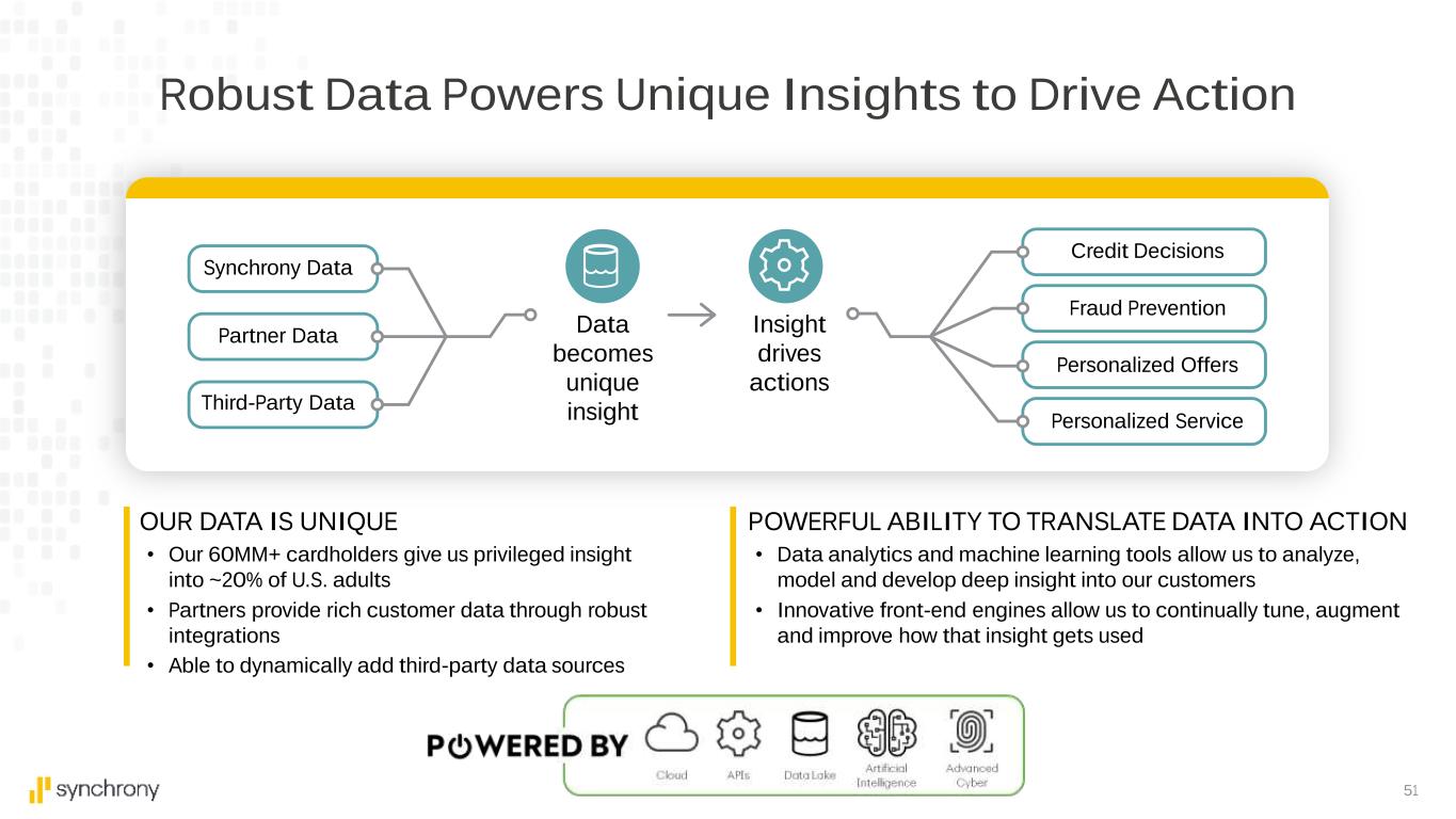 51 Advanced Cyber Artificial Intelligence Data LakeAPIsCloud P WERED BY OUR DATA IS UNIQUE • Our 60MM+ cardholders give us privileged insight into ~20% of U.S. adults • Partners provide rich customer data through robust integrations • Able to dynamically add third-party data sources POWERFUL ABILITY TO TRANSLATE DATA INTO ACTION • Data analytics and machine learning tools allow us to analyze, model and develop deep insight into our customers • Innovative front-end engines allow us to continually tune, augment and improve how that insight gets used Robust Data Powers Unique Insights to Drive Action Data becomes unique insight Insight drives actions Synchrony Data Partner Data Third-Party Data Credit Decisions Fraud Prevention Personalized Offers Personalized Service