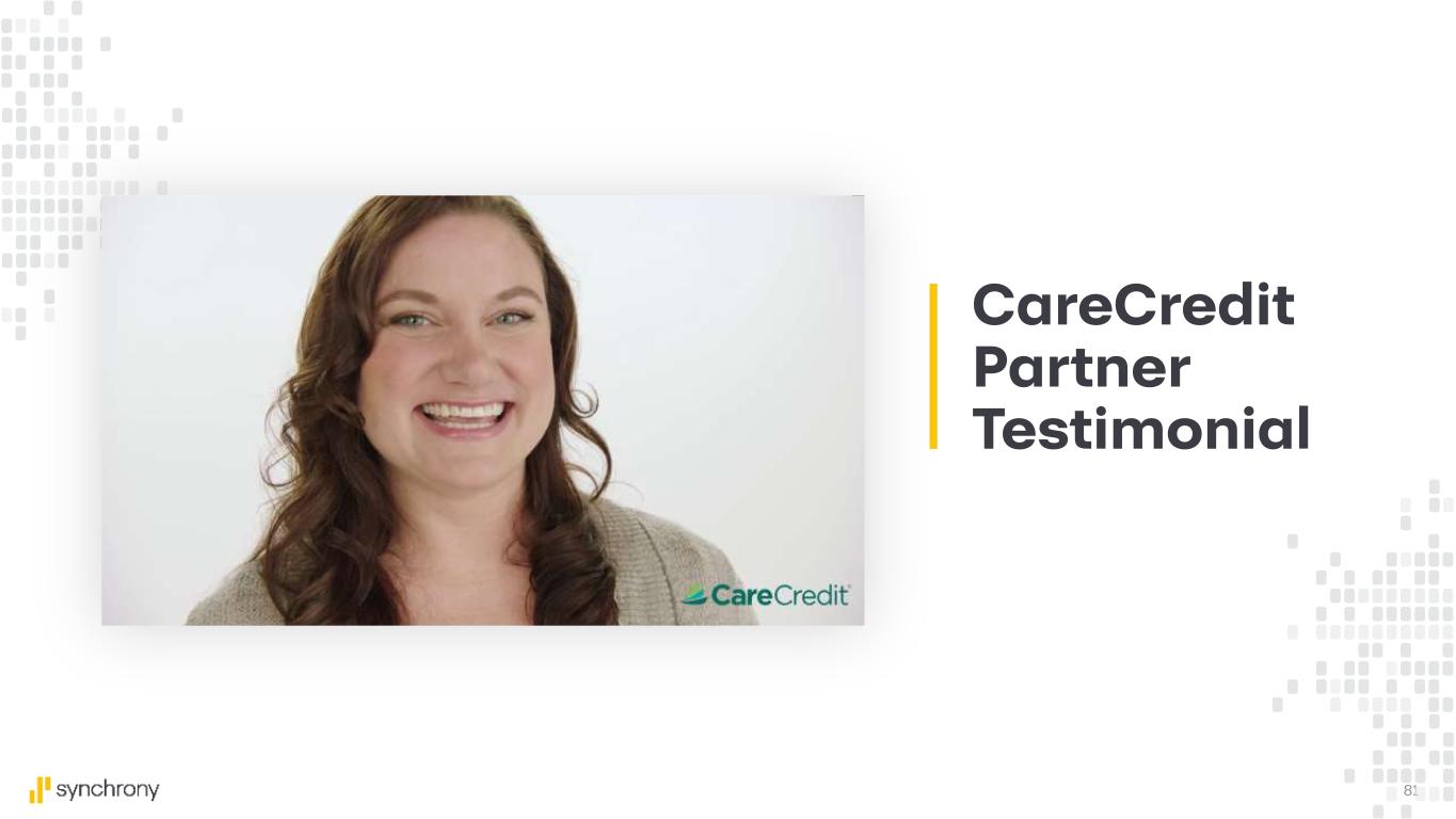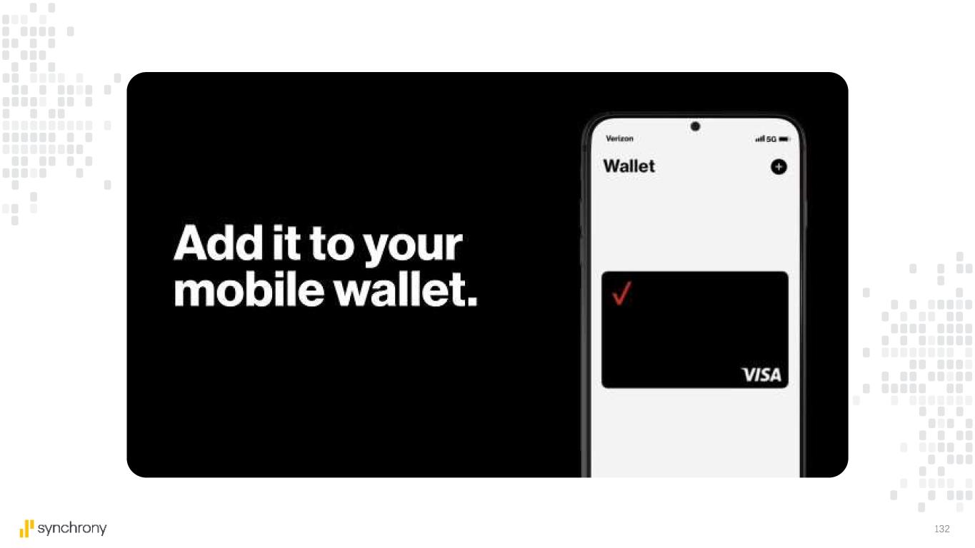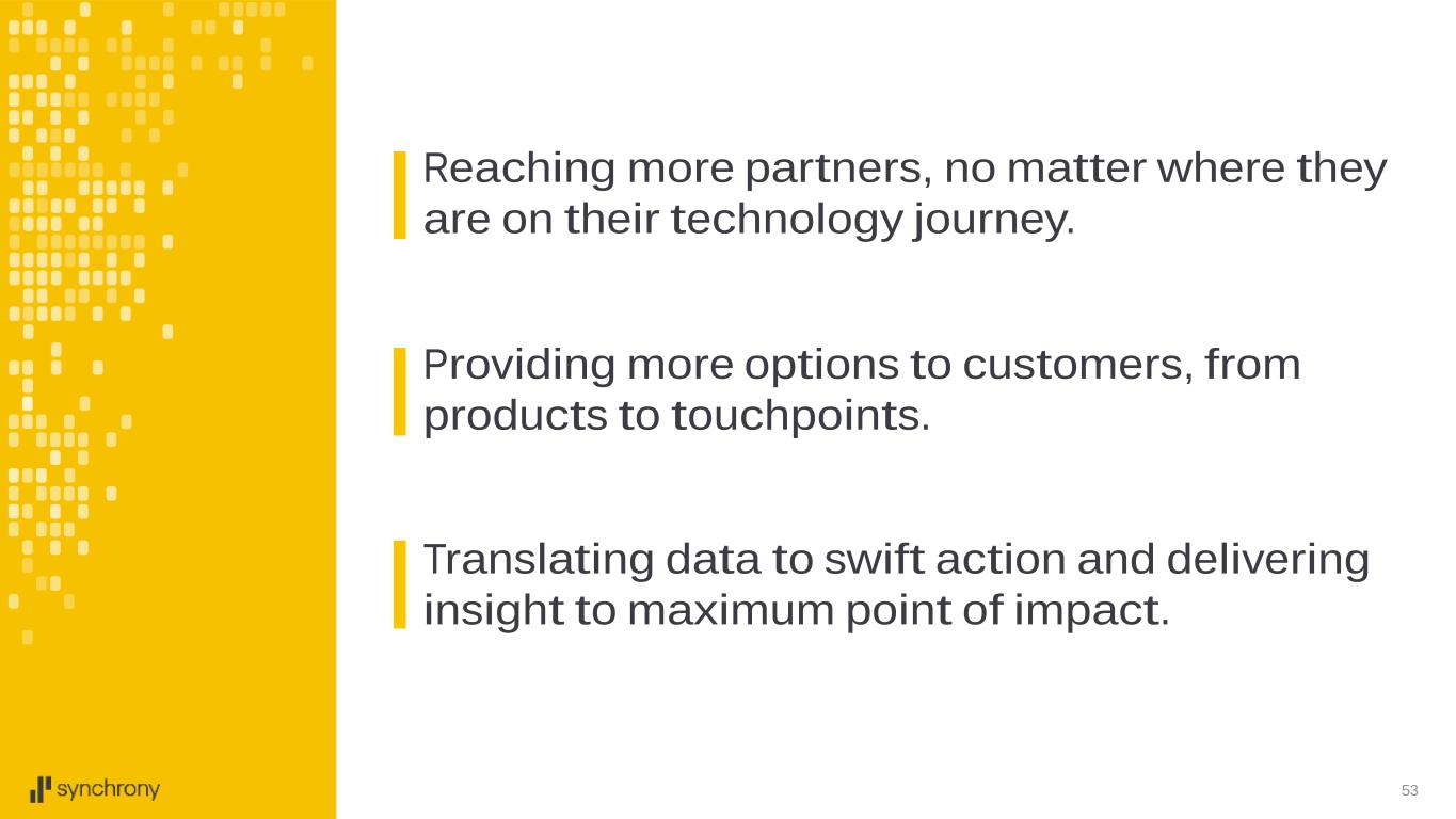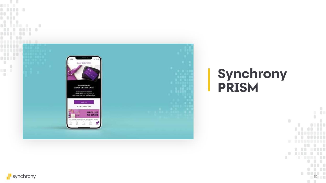 50 Partner Touch PointsSynchrony Touch Points Store Direct-to-Device Partner Web Platforms Email Virtual Agent Synchrony Native App Store POS Partner Native App (SyPI) Text Online Mobile Revolving BNPL/Installments Commercial PLCC DUAL CARD CO-BRAND INSTALLMENTS & LEASING INSTALLMENTS & BNPL SECURED BUSINESS REVOLVING CREDIT INVOICE-BASED SECURED NETWORK SYNCHRONY MC KEY Demonstrated in video Not in video, but Not currently