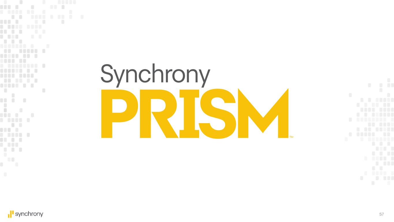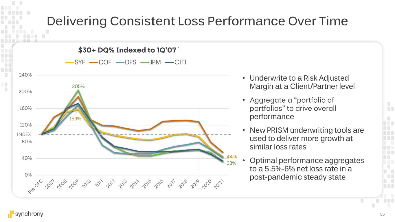 56 Delivering Consistent Loss Performance Over Time • Underwrite to a Risk Adjusted Margin at a Client/Partner level • performance • New PRISM underwriting tools are used to deliver more growth at similar loss rates • Optimal performance aggregates to a 5.5%-6% net loss rate in a post-pandemic steady state 159% 44% 205% 33% 0% 40% 80% 120% 160% 200% 240% 1 SYF COF DFS JPM CITI INDEX