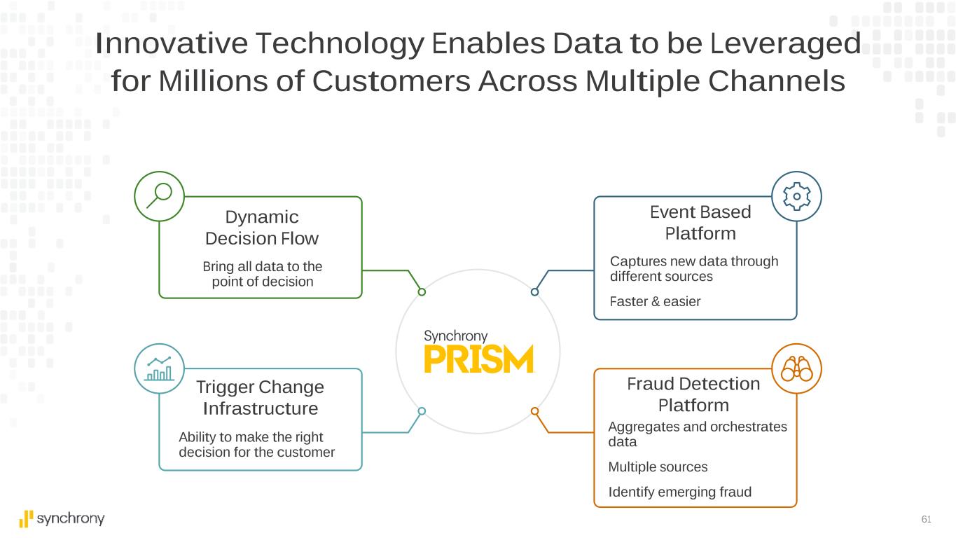 60 Harnessing Years of Customer Data and Client Relationships PERSONAL PROFILES Core Bureau Trended Data • Payment/Delinquency History • Inquiries/Time on File • Revolving Balances/Lines Synchrony Data • 100MM+1 customers and billions of transactions • Multiple accounts and touchpoints Client Specific Data • Highlights customer engagement (i.e., frequency, spend) • Proprietary at the Client level Alternative Data • Utility Data • Digital Footprint/Identity • Income Assets/Cash Flow • Payday Loan REAL-TIME DEPLOY OF CREDIT DECISIONS More Sources of Data Added Every Day