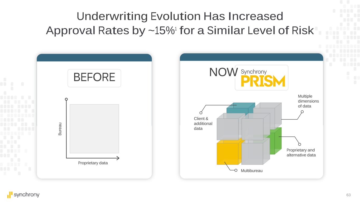 63 Underwriting Evolution Has Increased Approval Rates by ~15%1 for a Similar Level of Risk BEFORE NOW Client & additional data Multiple dimensions of data Proprietary and alternative data Multibureau Proprietary data B u re a u