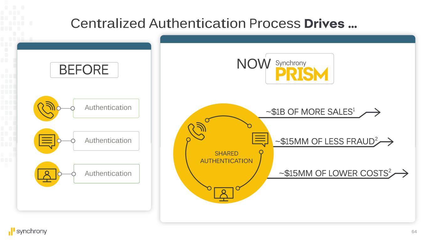 64 Centralized Authentication Process Authentication Authentication Authentication SHARED AUTHENTICATION ~$1B OF MORE SALES1 ~$15MM OF LESS FRAUD2 ~$15MM OF LOWER COSTS2 NOWBEFORE