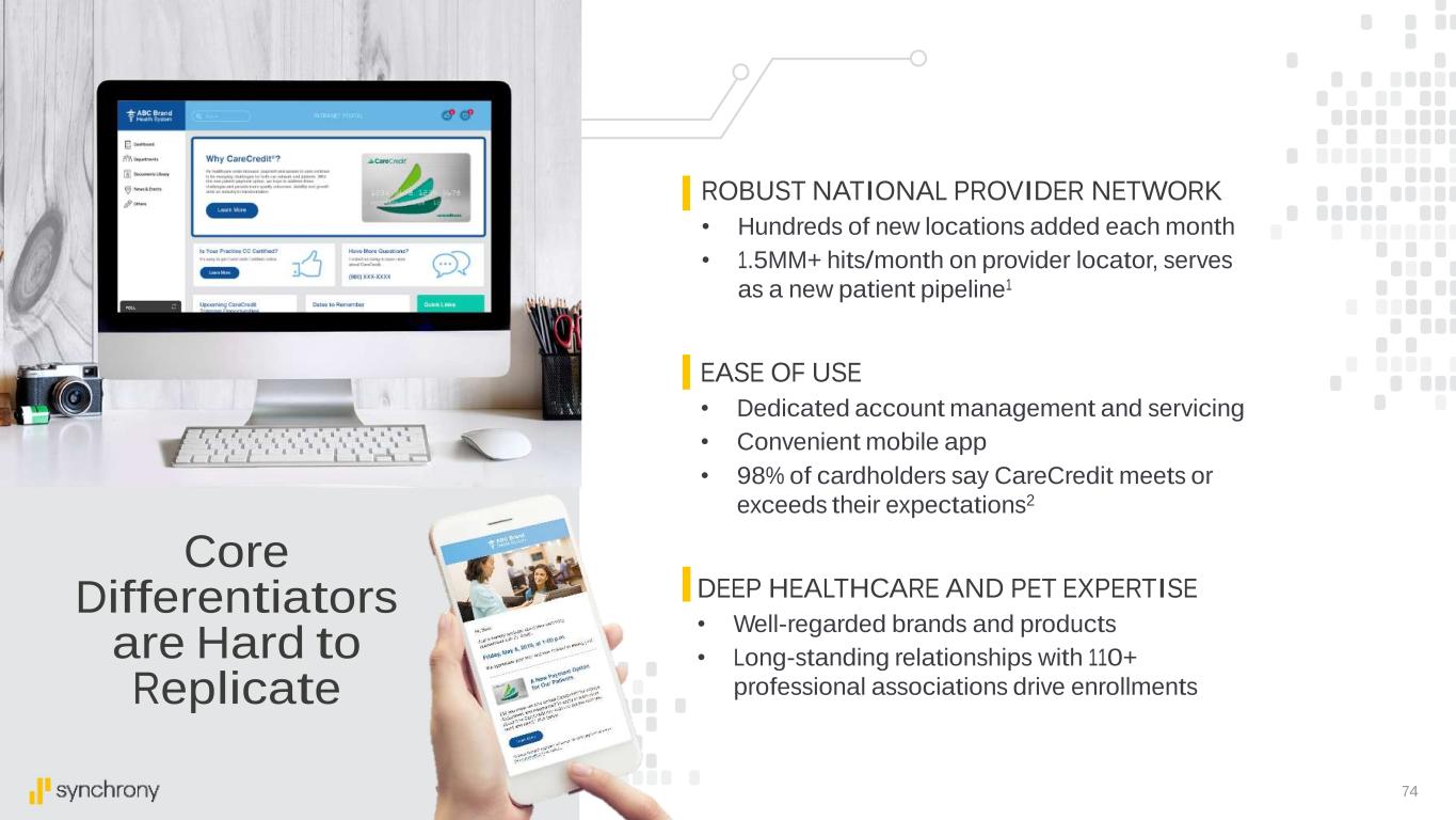 74 ROBUST NATIONAL PROVIDER NETWORK • Hundreds of new locations added each month • 1.5MM+ hits/month on provider locator, serves as a new patient pipeline1 EASE OF USE • Dedicated account management and servicing • Convenient mobile app • 98% of cardholders say CareCredit meets or exceeds their expectations2 DEEP HEALTHCARE AND PET EXPERTISE • Well-regarded brands and products • Long-standing relationships with 110+ professional associations drive enrollments Core Differentiators are Hard to Replicate