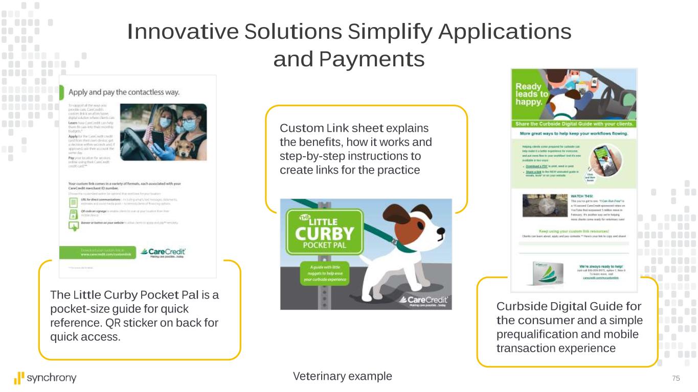 75 Custom Link sheet explains the benefits, how it works and step-by-step instructions to create links for the practice The Little Curby Pocket Pal is a pocket-size guide for quick reference. QR sticker on back for quick access. Curbside Digital Guide for the consumer and a simple prequalification and mobile transaction experience Innovative Solutions Simplify Applications and Payments Veterinary example