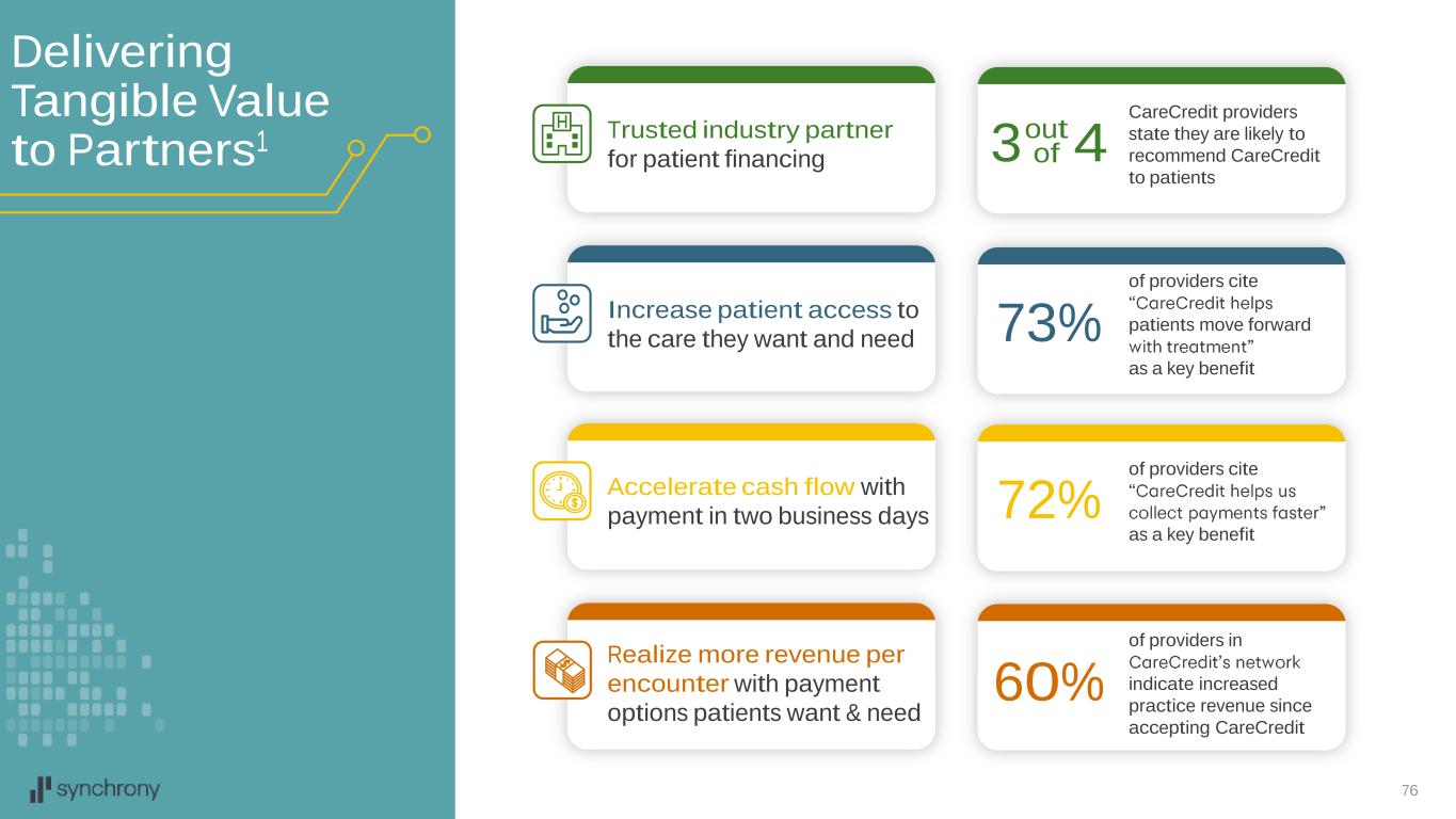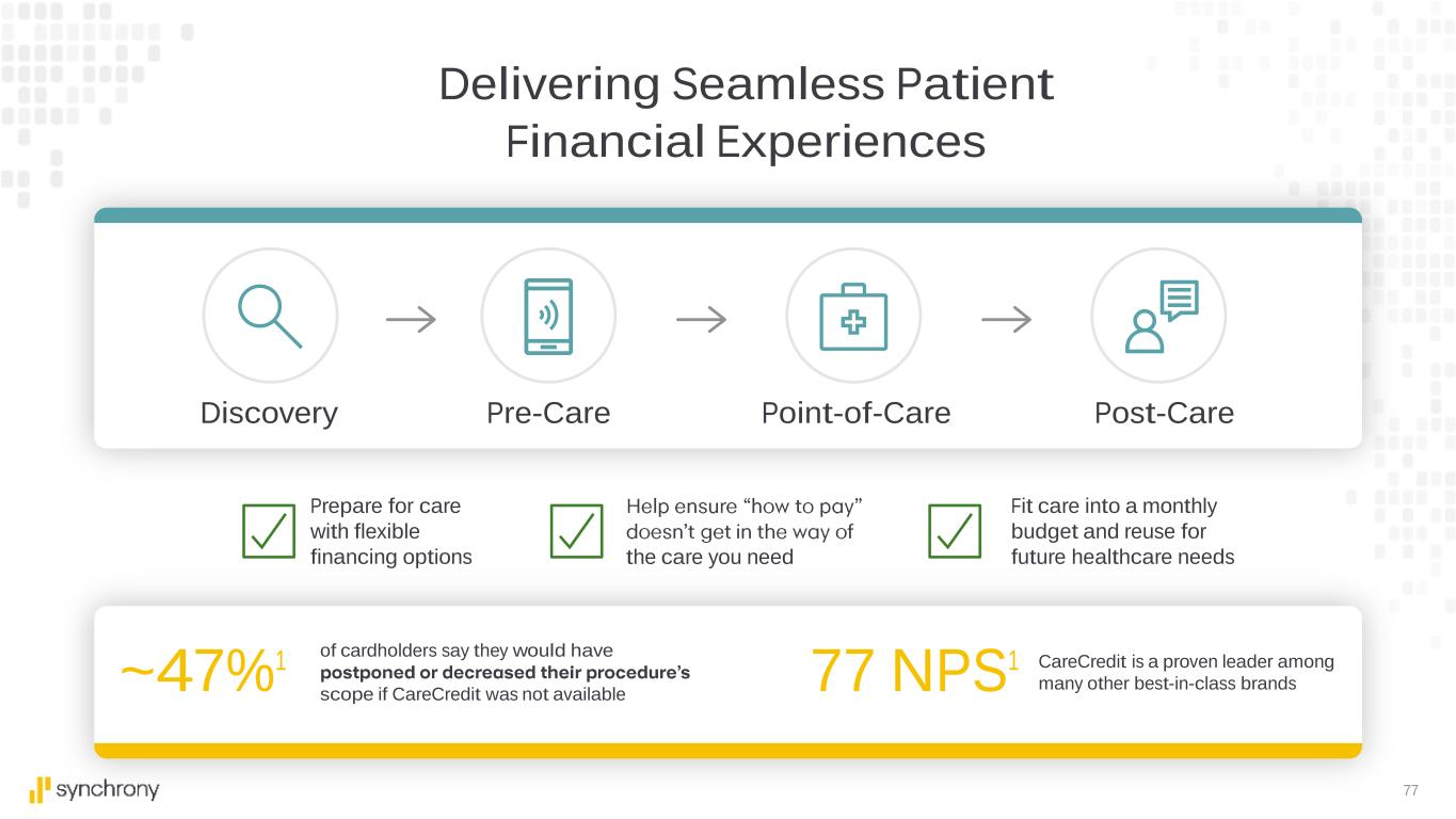 76 Delivering Tangible Value to Partners1 of providers cite patients move forward as a key benefit of providers in indicate increased practice revenue since accepting CareCredit of providers cite as a key benefit Increase patient access to the care they want and need Realize more revenue per encounter with payment options patients want & need Accelerate cash flow with payment in two business days Trusted industry partner for patient financing CareCredit providers state they are likely to recommend CareCredit to patients 73% 60% 72% 3 4out of