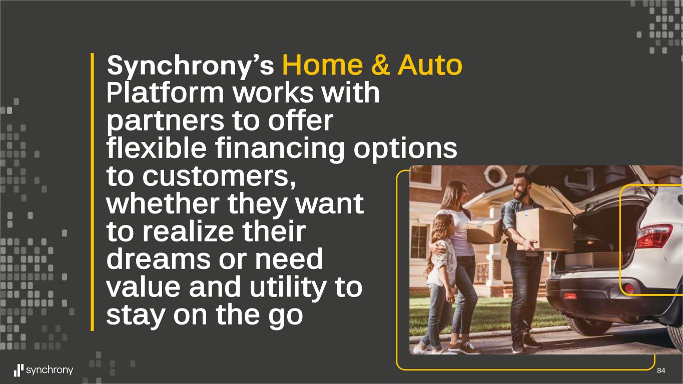84 Home & Auto Platform works with partners to offer flexible financing options to customers, whether they want to realize their dreams or need value and utility to stay on the go