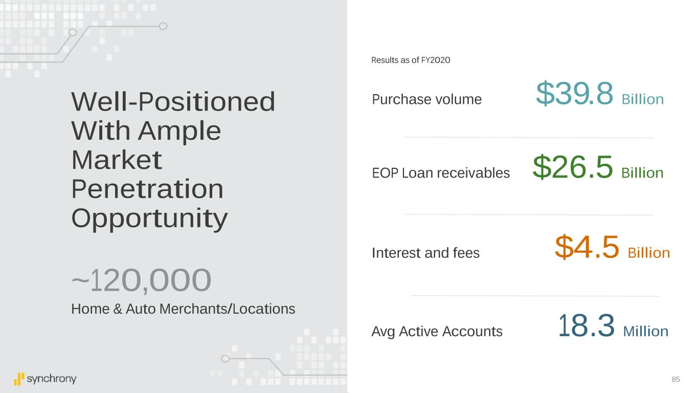 85 Purchase volume $39.8 Billion EOP Loan receivables $26.5 Billion Interest and fees $4.5 Billion Avg Active Accounts 18.3 Million Results as of FY2020 ~120,000 Home & Auto Merchants/Locations Well-Positioned With Ample Market Penetration Opportunity