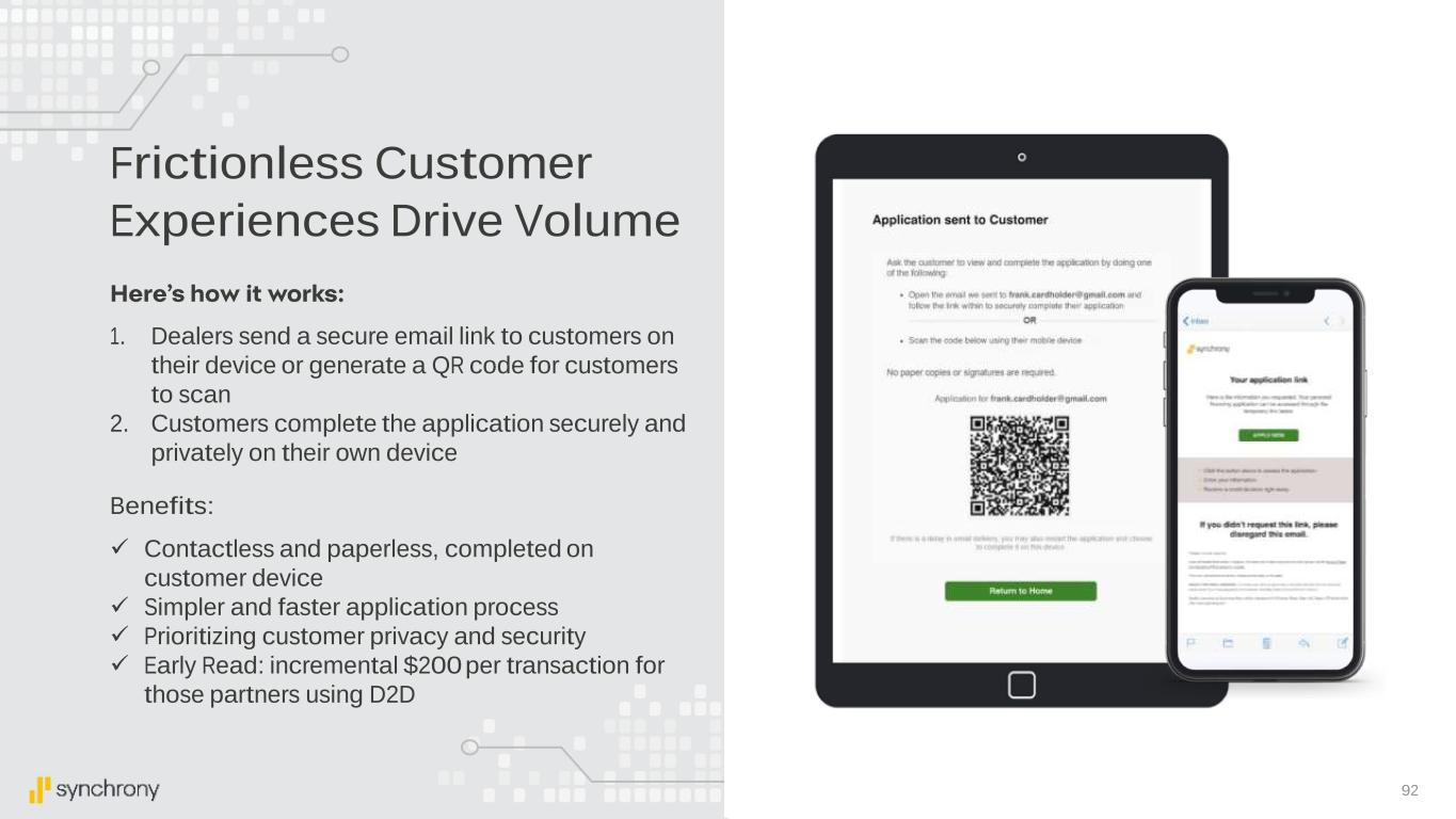 92 P L E A S E V I E W I N S L I D E S H O W P R E S E N T A T I O N M O D E . Frictionless Customer Experiences Drive Volume Benefits: 1. Dealers send a secure email link to customers on their device or generate a QR code for customers to scan 2. Customers complete the application securely and privately on their own device ✓ Contactless and paperless, completed on customer device ✓ Simpler and faster application process ✓ Prioritizing customer privacy and security ✓ Early Read: incremental $200 per transaction for those partners using D2D