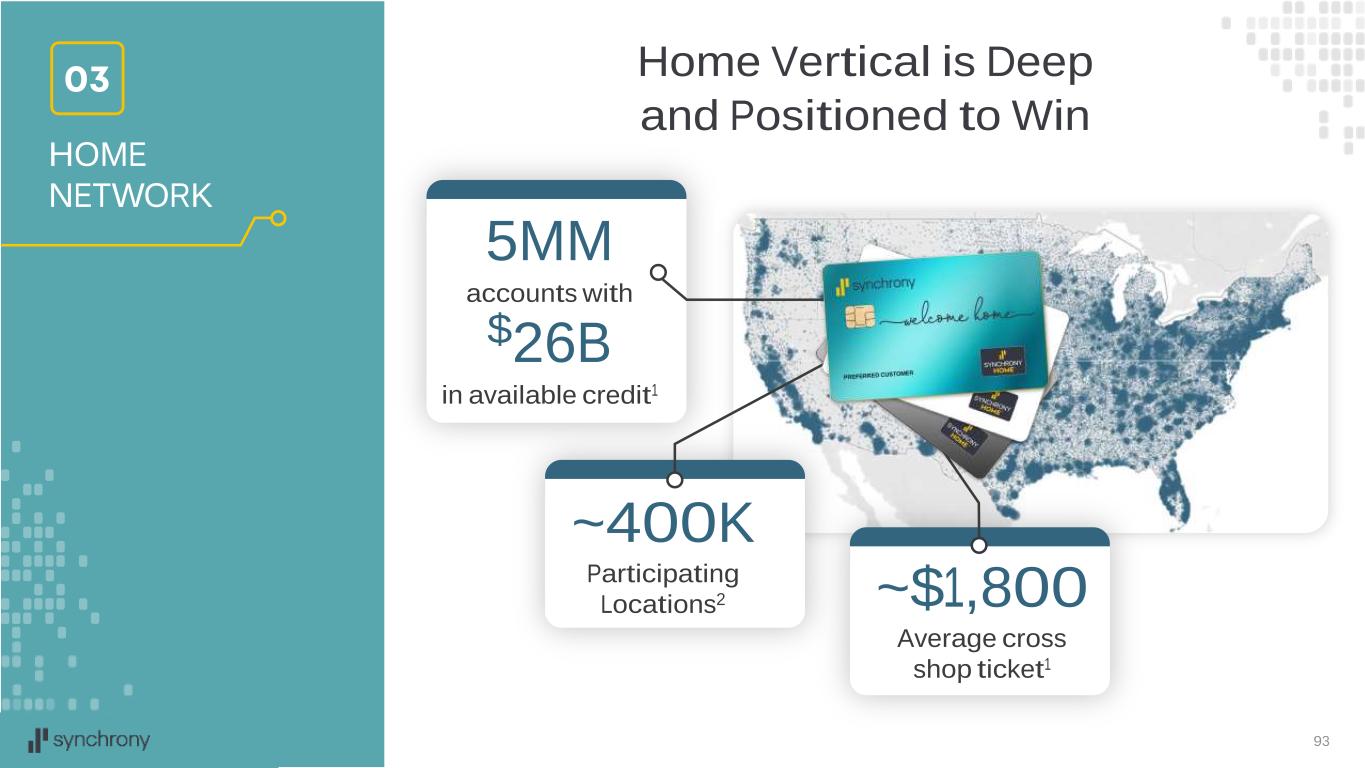 93 HOME NETWORK 5MM accounts with $26B in available credit1 ~$1,800 Average cross shop ticket1 ~400K Participating Locations2 Home Vertical is Deep and Positioned to Win
