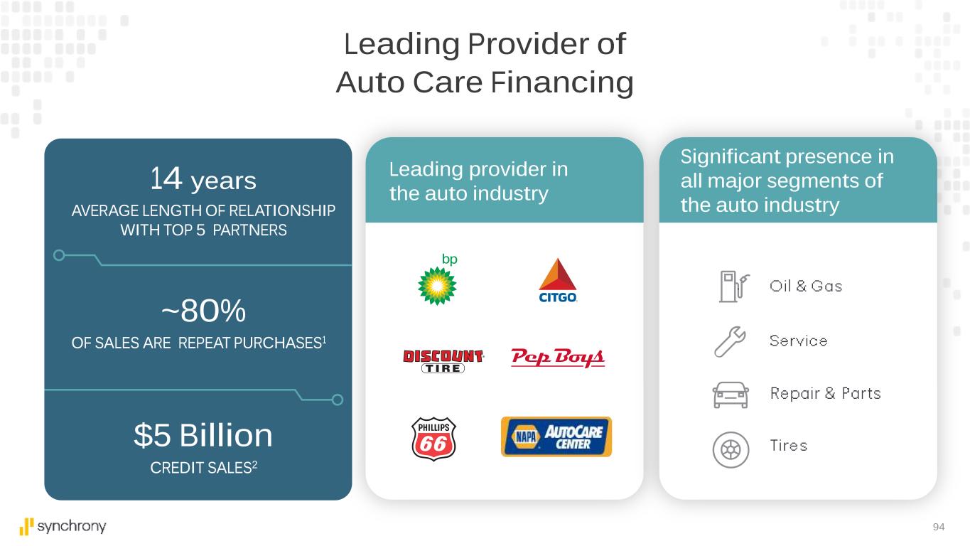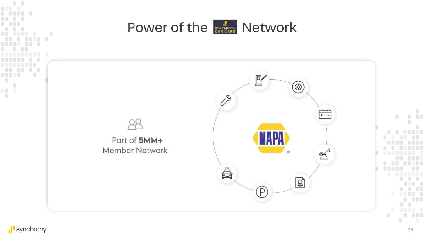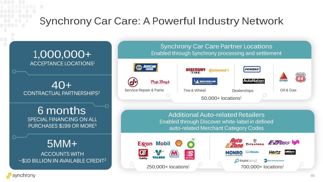95 SPECIAL FINANCING ON ALL PURCHASES $199 OR MORE3 6 months CONTRACTUAL PARTNERSHIPS2 5MM+ ACCOUNTS WITH ~$10 BILLION IN AVAILABLE CREDIT2 1,000,000+ ACCEPTANCE LOCATIONS1 Synchrony Car Care Partner Locations Enabled through Synchrony processing and settlement 50,000+ locations1 Additional Auto-related Retailers Enabled through Discover white-label in defined auto-related Merchant Category Codes 250,000+ locations1 700,000+ locations1 Service Repair & Parts Tire & Wheel Dealerships Oil & Gas Synchrony Car Care: A Powerful Industry Network 40+