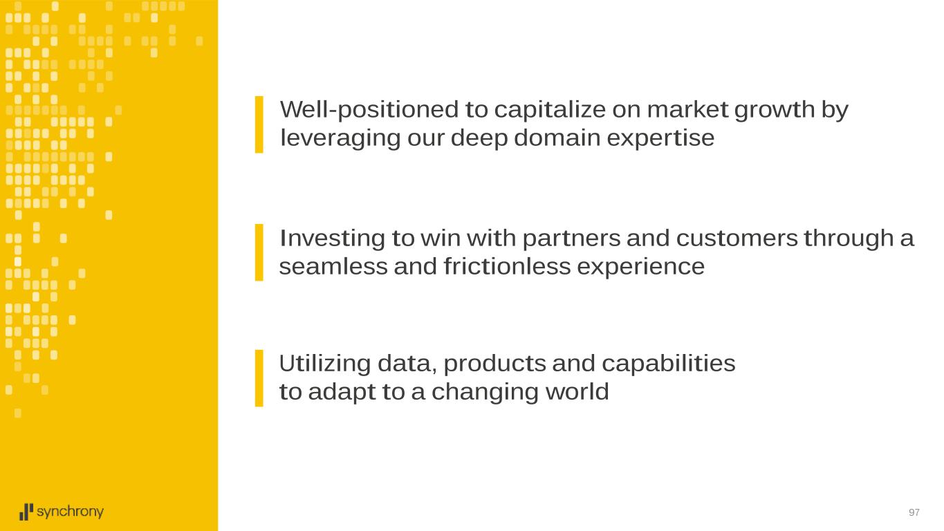 97 Well-positioned to capitalize on market growth by leveraging our deep domain expertise Investing to win with partners and customers through a seamless and frictionless experience Utilizing data, products and capabilities to adapt to a changing world