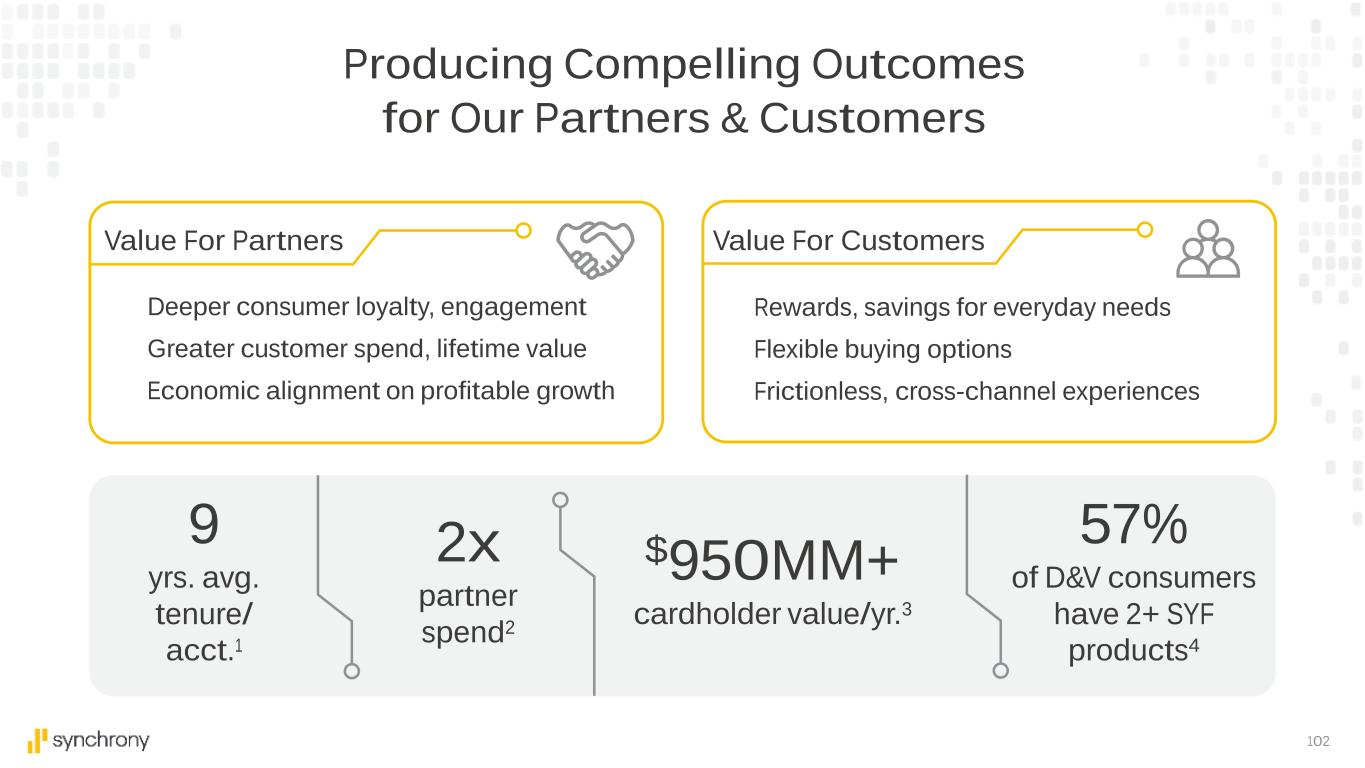 102 Deeper consumer loyalty, engagement Greater customer spend, lifetime value Economic alignment on profitable growth Value For Partners Value For Customers Rewards, savings for everyday needs Flexible buying options Frictionless, cross-channel experiences 9 yrs. avg. tenure/ acct.1 57% of D&V consumers have 2+ SYF products4 2x partner spend2 $950MM+ cardholder value/yr.3 Producing Compelling Outcomes for Our Partners & Customers