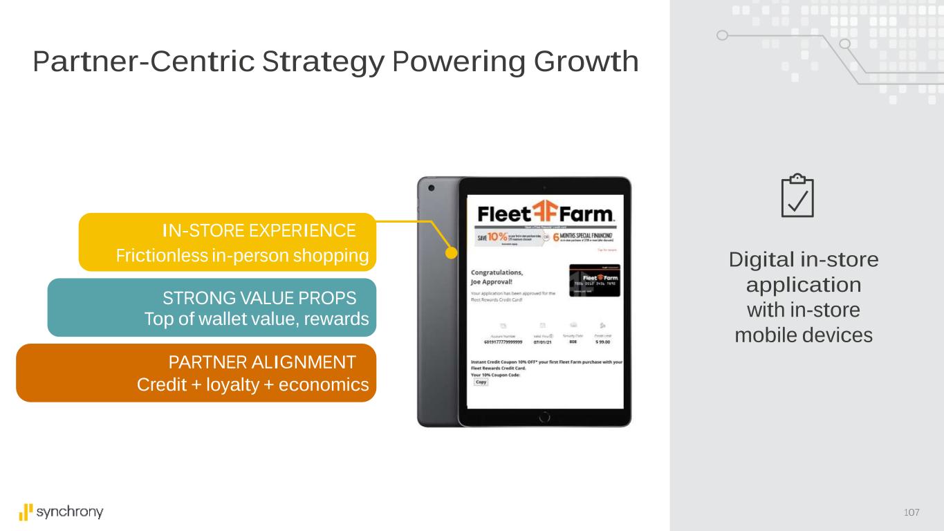 106 Strong in-store rewards + Strong in-world rewards PARTNER ALIGNMENT Credit + loyalty + economics STRONG VALUE PROPS Top of wallet value, rewards Partner-Centric Strategy Powering Growth