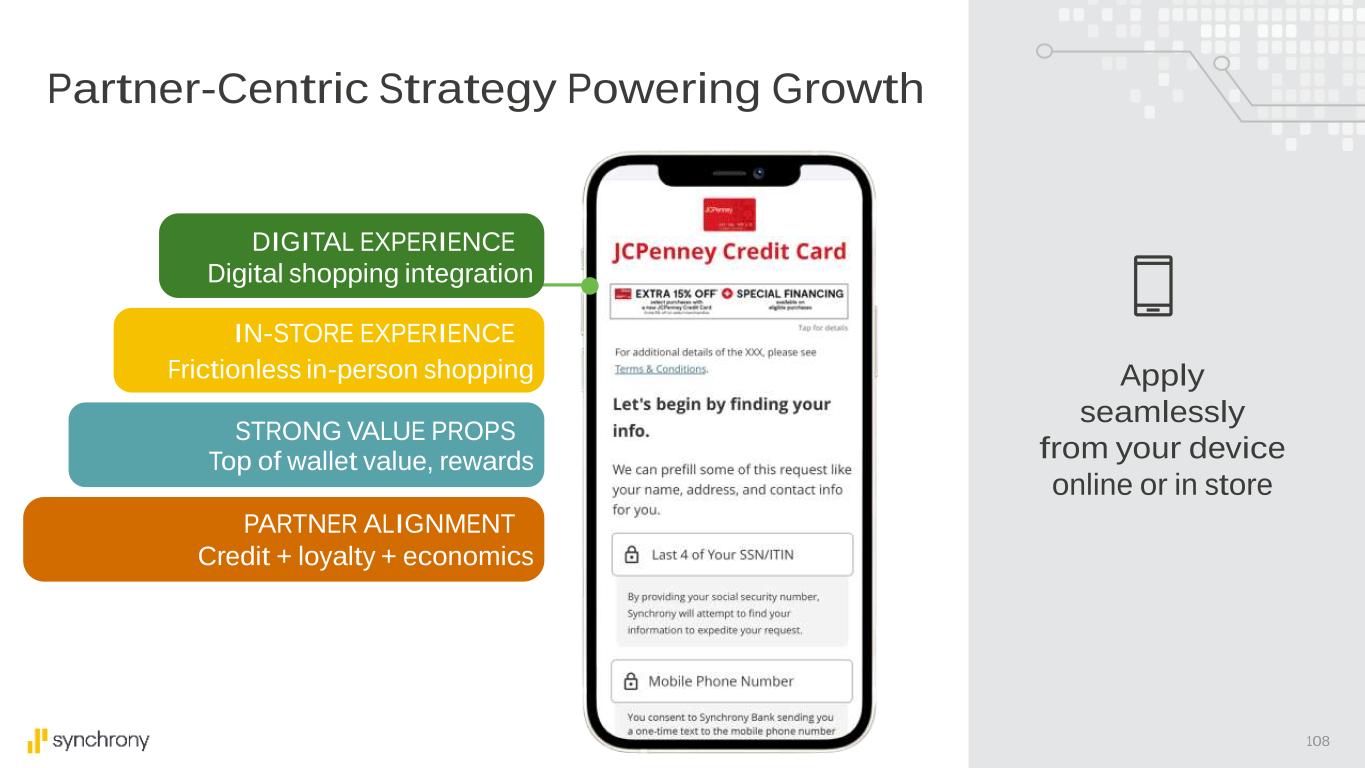 107 Digital in-store application with in-store mobile devices PARTNER ALIGNMENT Credit + loyalty + economics STRONG VALUE PROPS Top of wallet value, rewards IN-STORE EXPERIENCE Frictionless in-person shopping Partner-Centric Strategy Powering Growth