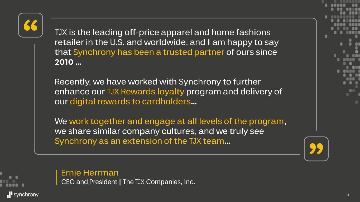 111 TJX is the leading off-price apparel and home fashions retailer in the U.S. and worldwide, and I am happy to say that Synchrony has been a trusted partner of ours since Recently, we have worked with Synchrony to further enhance our TJX Rewards loyalty program and delivery of our digital rewards to cardholders We work together and engage at all levels of the program, we share similar company cultures, and we truly see Synchrony as an extension of the TJX team Ernie Herrman CEO and President | The TJX Companies, Inc.