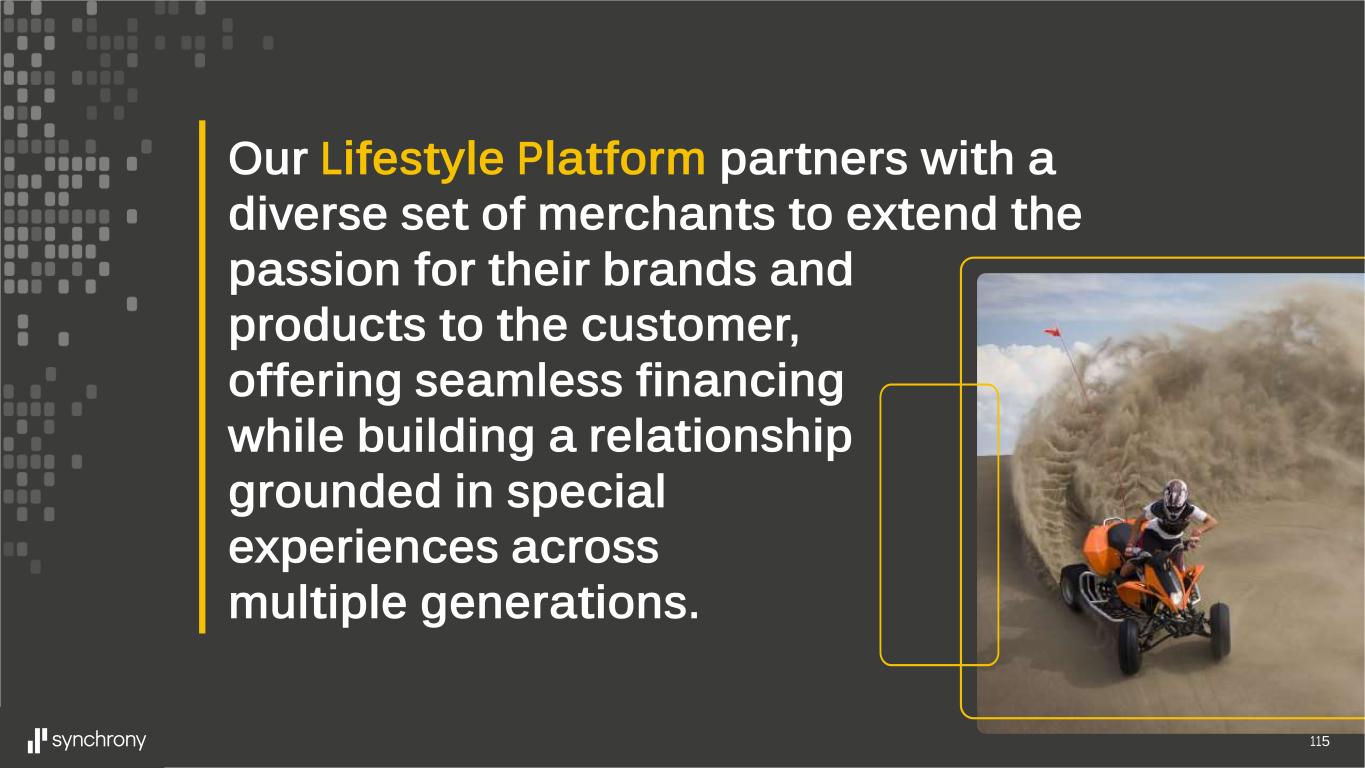 115 Our Lifestyle Platform partners with a diverse set of merchants to extend the passion for their brands and products to the customer, offering seamless financing while building a relationship grounded in special experiences across multiple generations.
