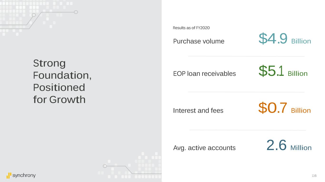 116 Avg. active accounts 2.6 Million Purchase volume $4.9 Billion EOP loan receivables $5.1 Billion Interest and fees $0.7 Billion Results as of FY2020 Strong Foundation, Positioned for Growth