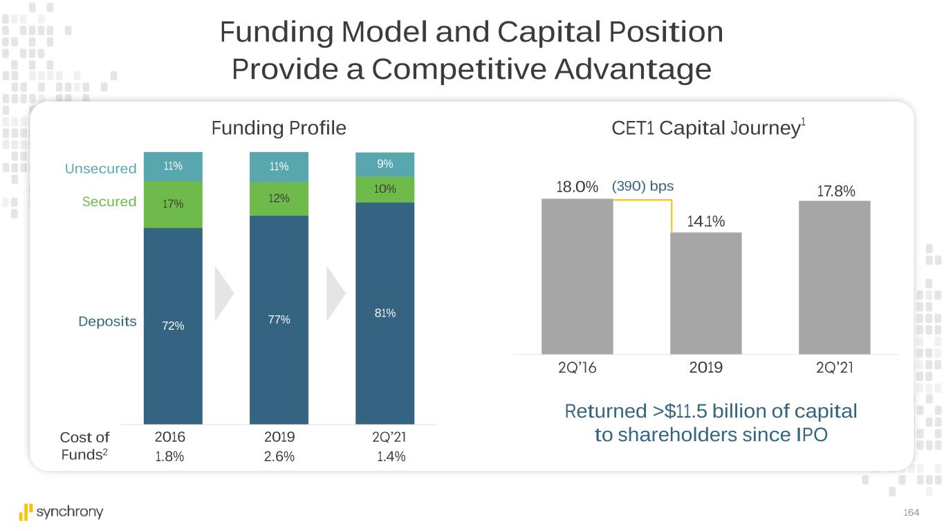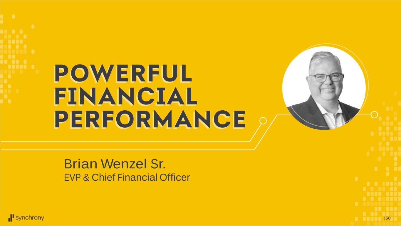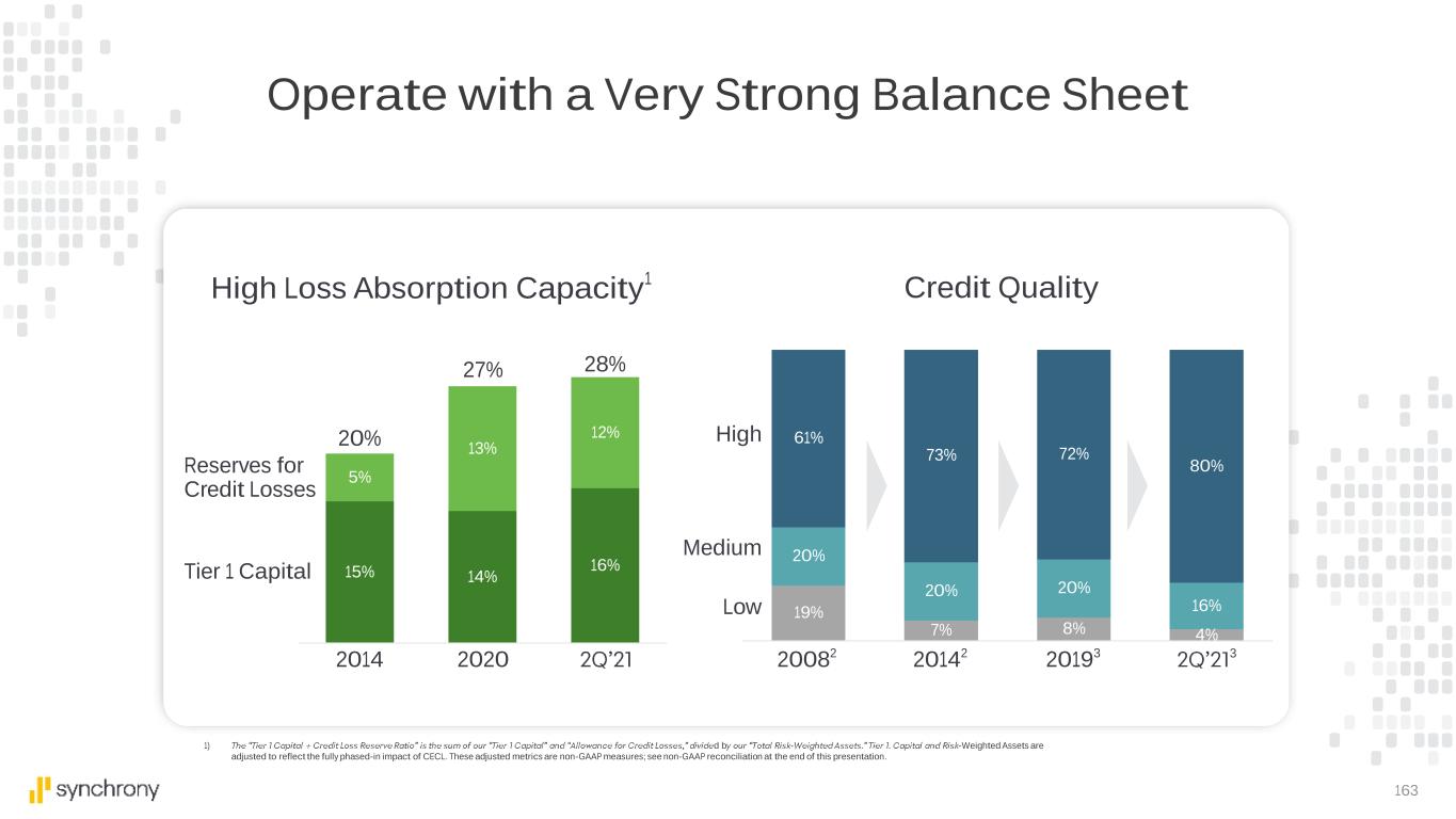 183 End Notes POWERFUL FINANCIAL PERFORMANCE and Powers Our Strong Foundation 1) Based on average new accounts per year from 2014-2020 2) Based on average life of account for total open accounts as of July 2021 Partner Model Powers Low- 1) Based on Synchrony internal analysis, representative of large retail partner. Costs to acquire excludes offer/rewards costs. 2) Source: Argus 3) Lifetime value representative of large retail partner account and is based on a vintage 10-year estimate of Net Finance Charges + Net Late Fees + Interchange Loyalty Cost Net Losses. Delivering Consistent Loss Performance Over Time 1) Peer delinquency information represents applicable U.S. Credit Card business units, sourced from company public filings. Effectively Managing Our Portfolio Through the Pandemic 1) Data is based on VantageScore credit scores available for our customers in each period, weighted by balance, as a % of period-end receivables. There are certain customer accounts for which a VantageScore credit score is not available where we use alternative sources to assess their credit and predict behavior. Scores >651 - Retailer Share Agreements (RSAs) Designed to Align Growth & Profitability 1) Each Retailer Share Agreement is different. Levels and payouts vary, but in general these metrics are used in program calculations. Operate with a Very Strong Balance Sheet 1) See footnote on slide for non-GAAP metric 2) Data prior to 2019 is based on FICO scores available for our customers in each period, weighted by balance, as a % of period-end receivables. If FICO score was not available credit bureau-based scores were mapped to a FICO equivalent. If neither score was available, the - each period, weighted by balance, as a % of period-end receivables. There are certain customer accounts for which a VantageScore credit score is not available where we use alternative sources to assess their credit and predict behavior. If neither score was available, the account - Funding Model and Capital Position Provide a Competitive Advantage two years in accordance with the interim final rule issued by U.S. banking agencies in March -in methodology, prior to CECL implementation. 2) Cost of funds are for years ended December 31, 2016 and 2019, and three months ended June 30, 2021