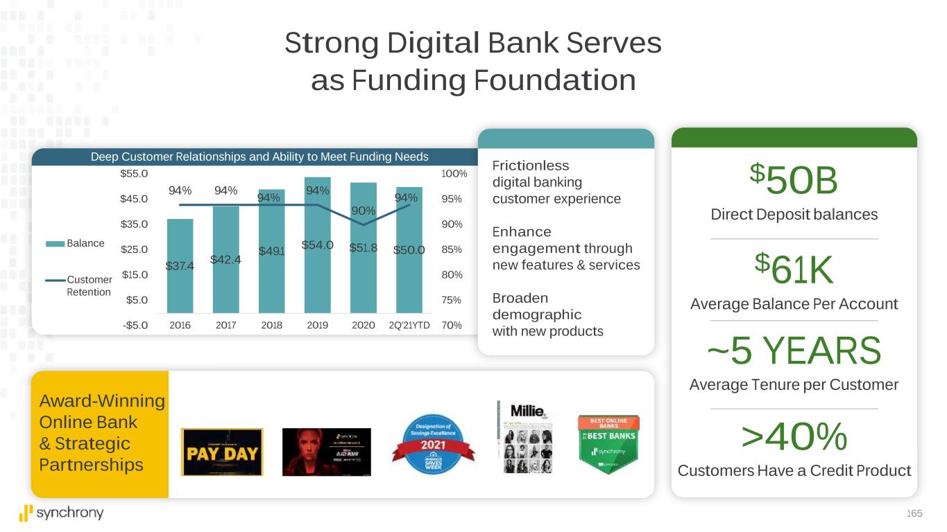 165 $37.4 $42.4 $49.1 $54.0 $51.8 $50.0 94% 94% 94% 94% 90% 94% 70% 75% 80% 85% 90% 95% 100% -$5.0 $5.0 $15.0 $25.0 $35.0 $45.0 $55.0 2016 2017 2018 2019 2020 2Q'21YTD Balance Customer Retention $61K Average Balance Per Account >40% Customers Have a Credit Product $50B Direct Deposit balances ~5 YEARS Average Tenure per Customer Deep Customer Relationships and Ability to Meet Funding Needs Award-Winning Online Bank & Strategic Partnerships Frictionless digital banking customer experience Enhance engagement through new features & services Broaden demographic with new products Strong Digital Bank Serves as Funding Foundation