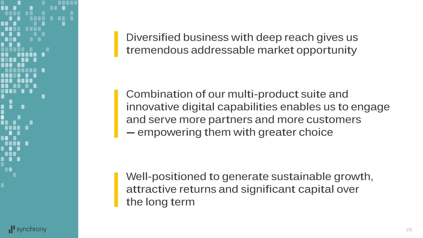 172 Synchrony enables commerce by delivering the leading financial ecosystem that connects our partners and our customers through world-class technology, products, and capabilities Life. Powered by Synchrony.