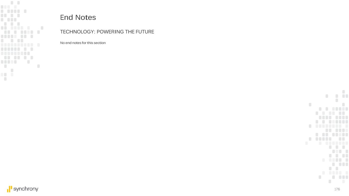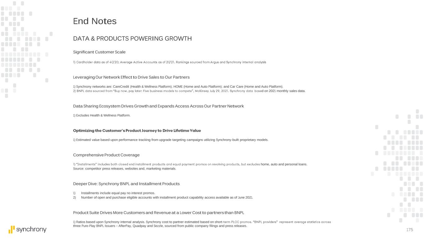 175 End Notes DATA & PRODUCTS POWERING GROWTH Significant Customer Scale sis Leveraging Our Network Effect to Drive Sales to Our Partners 1) Synchrony networks are: CareCredit (Health & Wellness Platform); HOME (Home and Auto Platform); and Car Care (Home and Auto Platform). d on 2021 monthly sales data. Data Sharing Ecosystem Drives Growth and Expands Access Across Our Partner Network 1) Excludes Health & Wellness Platform. 1) Estimated value based upon performance tracking from upgrade targeting campaigns utilizing Synchrony-built proprietary models. Comprehensive Product Coverage home, auto and personal loans. Source: competitor press releases, websites and, marketing materials. Deeper Dive: Synchrony BNPL and Installment Products 1) Installments include equal pay no interest promos. 2) Number of open and purchase eligible accounts with installment product capability access available as of June 2021. Product Suite Drives More Customers and Revenue at a Lower Cost to partners than BNPL 1) Ratios based upon Synchrony internal analysis. Synchrony cost to partner estimated based on short- three Pure-Play BNPL Issuers AfterPay, Quadpay and Sezzle, sourced from public company filings and press releases.