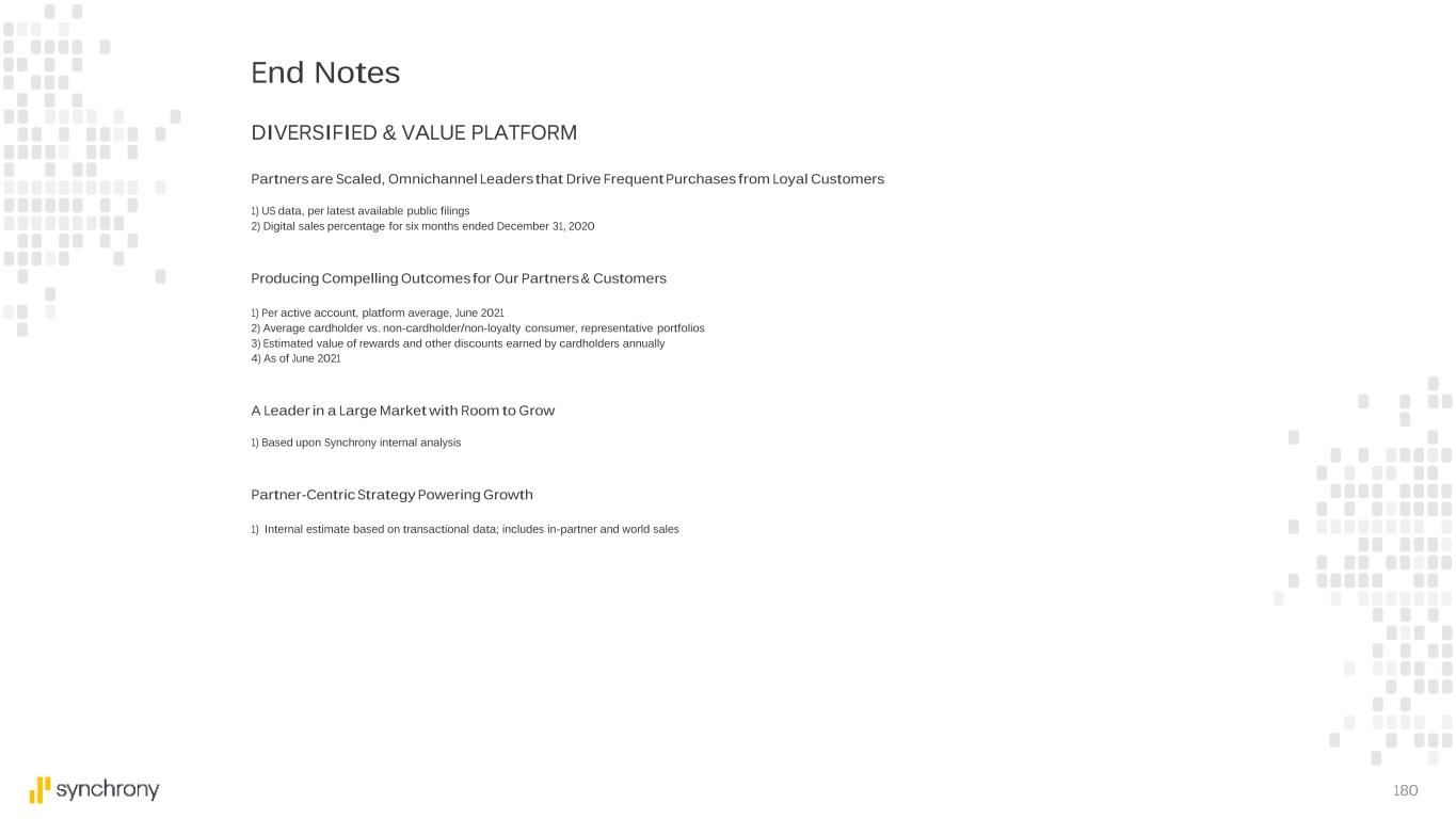 180 End Notes DIVERSIFIED & VALUE PLATFORM Partners are Scaled, Omnichannel Leaders that Drive Frequent Purchases from Loyal Customers 1) US data, per latest available public filings 2) Digital sales percentage for six months ended December 31, 2020 Producing Compelling Outcomes for Our Partners & Customers 1) Per active account, platform average, June 2021 2) Average cardholder vs. non-cardholder/non-loyalty consumer, representative portfolios 3) Estimated value of rewards and other discounts earned by cardholders annually 4) As of June 2021 A Leader in a Large Market with Room to Grow 1) Based upon Synchrony internal analysis Partner-Centric Strategy Powering Growth 1) Internal estimate based on transactional data; includes in-partner and world sales