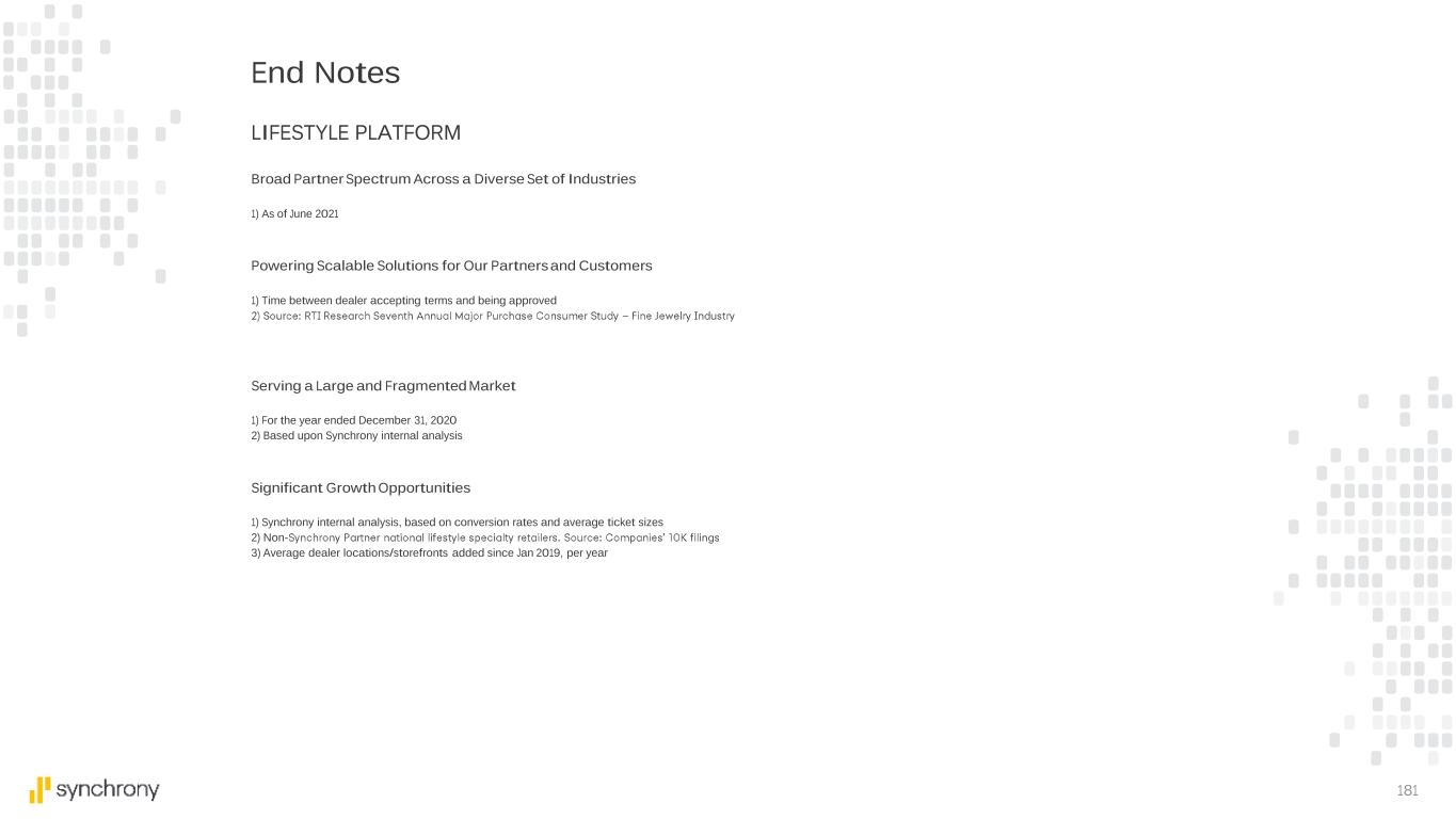 181 End Notes LIFESTYLE PLATFORM Broad Partner Spectrum Across a Diverse Set of Industries 1) As of June 2021 Powering Scalable Solutions for Our Partners and Customers 1) Time between dealer accepting terms and being approved Serving a Large and Fragmented Market 1) For the year ended December 31, 2020 2) Based upon Synchrony internal analysis Significant Growth Opportunities 1) Synchrony internal analysis, based on conversion rates and average ticket sizes 2) Non- 3) Average dealer locations/storefronts added since Jan 2019, per year