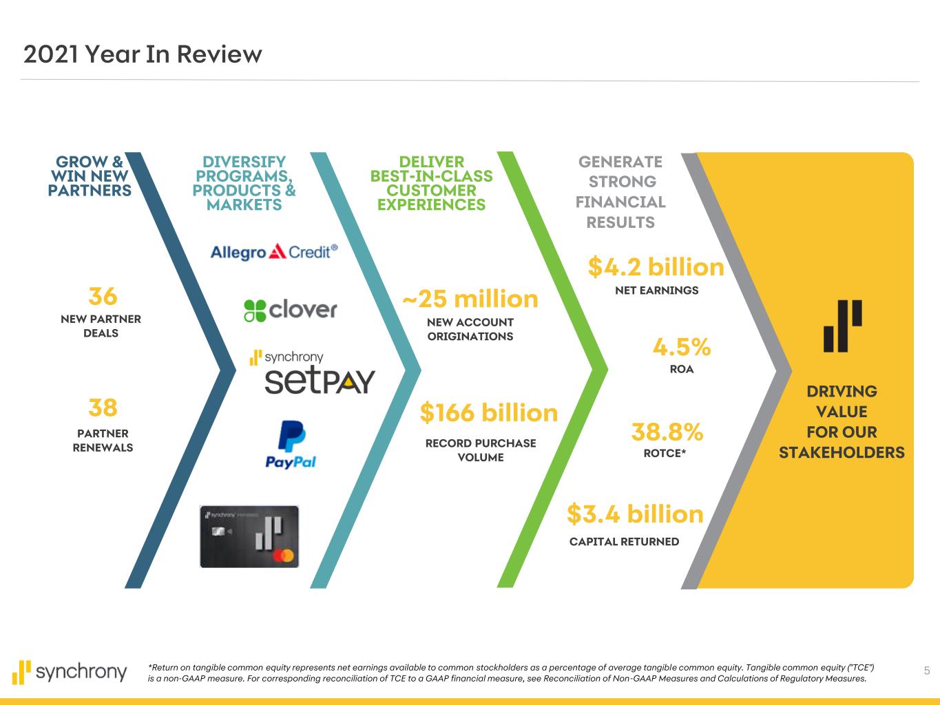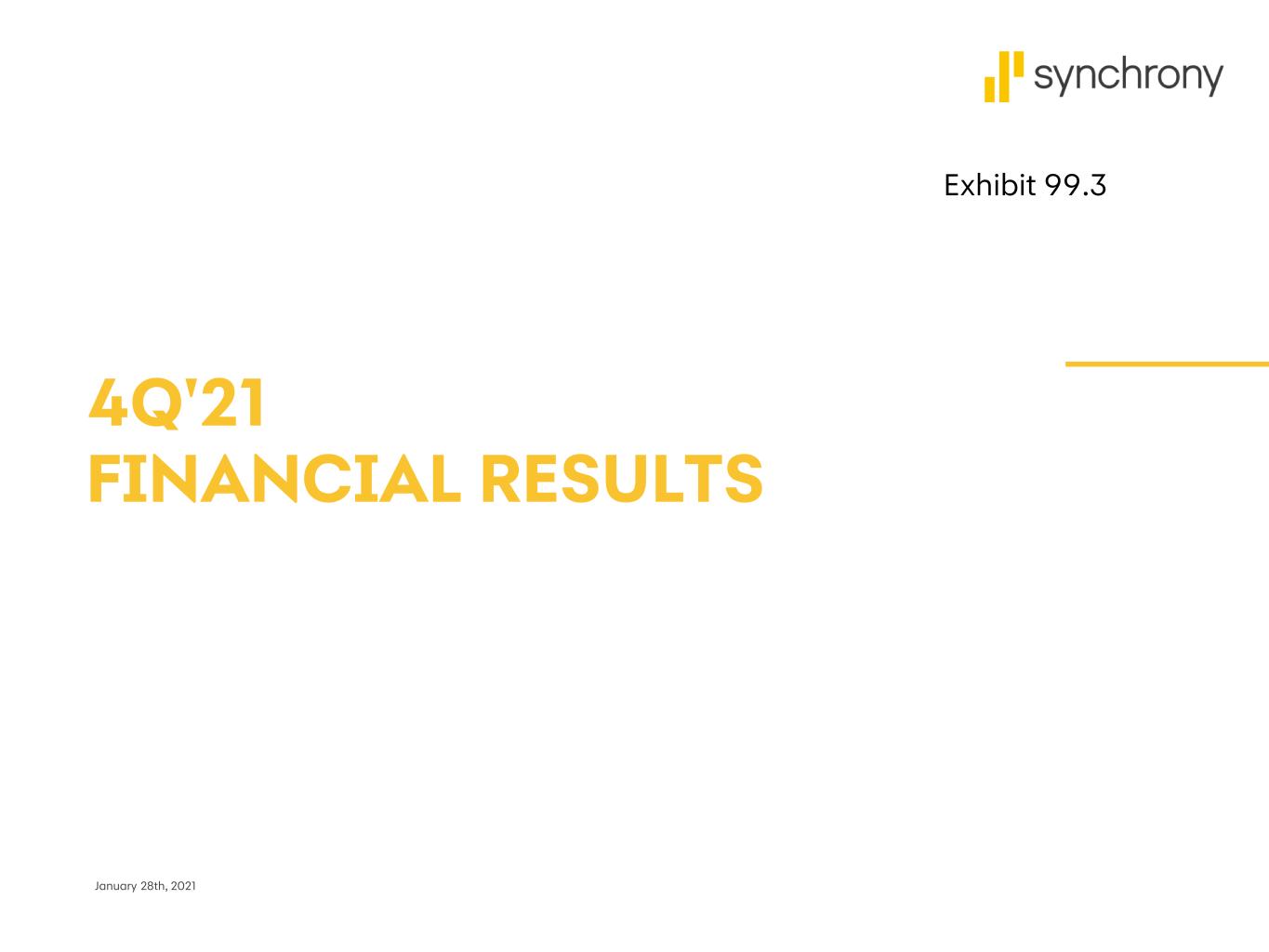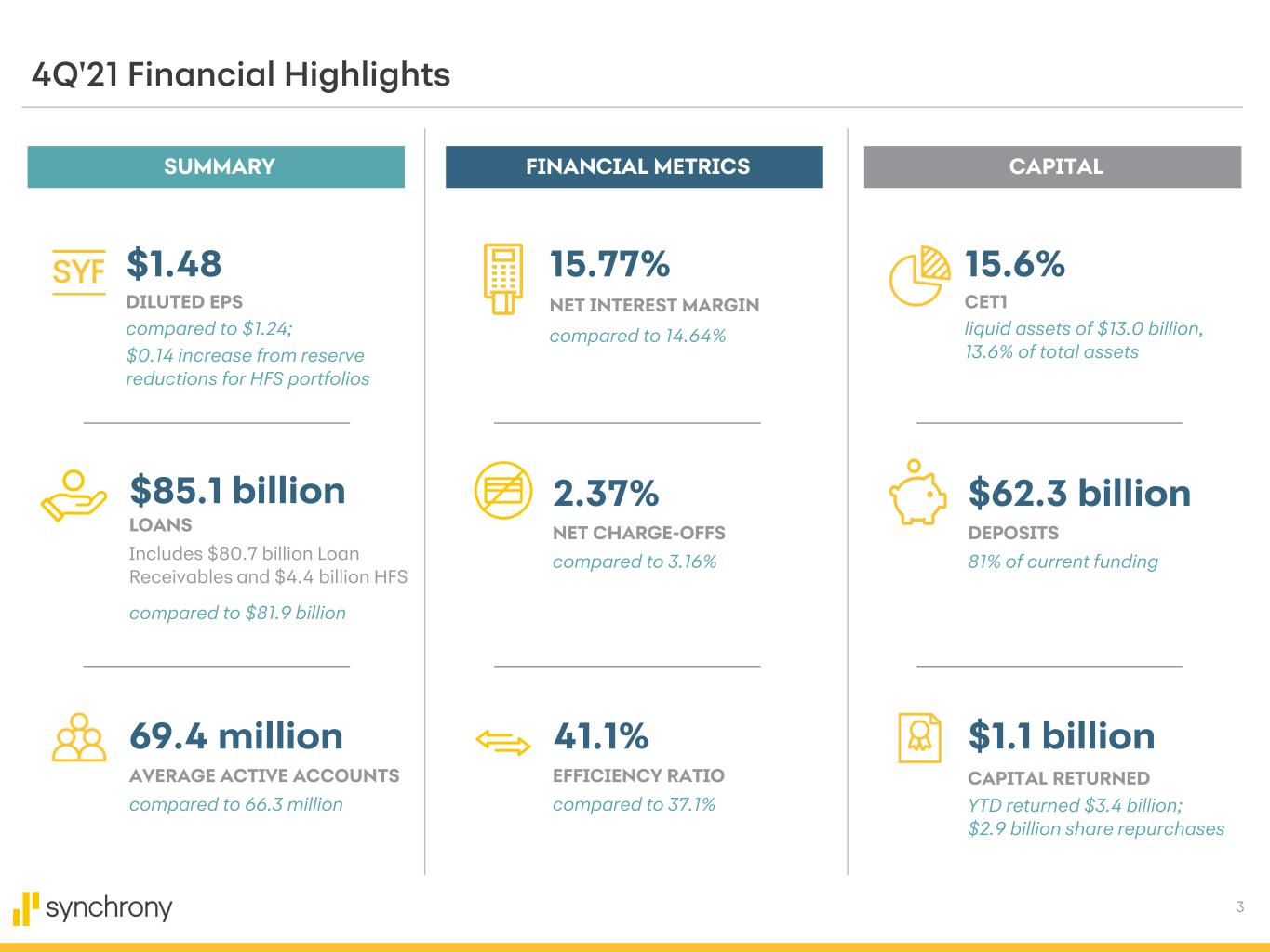 2 Cautionary Statement Regarding Forward-Looking Statements The following slides are part of a presentation by Synchrony Financial in connection with reporting quarterly financial results. No representation is made that the information in these slides is complete. For additional information, see the earnings release and financial supplement included as exhibits to our Current Report on Form 8-K filed today and available on our website (www.synchronyfinancial.com) and the SEC's website (www.sec.gov). All references to net earnings and net income are intended to have the same meaning. All comparisons are for the fourth quarter of 2021 compared to the fourth quarter of 2020, unless otherwise noted. This presentation contains certain forward-looking statements as defined in Section 27A of the Securities Act of 1933, as amended, and Section 21E of the Securities Exchange Act of 1934, as amended, which are subject to the "safe harbor" created by those sections. Forward-looking statements may be identified by words such as "expects," "intends," "anticipates," "plans," "believes," "seeks," "targets," "outlook," "estimates," "will," "should," "may" or words of similar meaning, but these words are not the exclusive means of identifying forward-looking statements. Forward- looking statements are based on management's current expectations and assumptions, and are subject to inherent uncertainties, risks and changes in circumstances that are difficult to predict. As a result, actual results could differ materially from those indicated in these forward-looking statements. Factors that could cause actual results to differ materially include global political, economic, business, competitive, market, regulatory and other factors and risks, such as: the impact of macroeconomic conditions and whether industry trends we have identified develop as anticipated, including the future impacts of the novel coronavirus disease (“COVID-19”) outbreak and measures taken in response thereto for which future developments are highly uncertain and difficult to predict; retaining existing partners and attracting new partners, concentration of our revenue in a small number of partners, and promotion and support of our products by our partners; cyber-attacks or other security breaches; disruptions in the operations of our and our outsourced partners' computer systems and data centers; the financial performance of our partners; the sufficiency of our allowance for credit losses and the accuracy of the assumptions or estimates used in preparing our financial statements, including those related to the CECL accounting guidance; higher borrowing costs and adverse financial market conditions impacting our funding and liquidity, and any reduction in our credit ratings; our ability to grow our deposits in the future; damage to our reputation; our ability to securitize our loan receivables, occurrence of an early amortization of our securitization facilities, loss of the right to service or sub-service our securitized loan receivables, and lower payment rates on our securitized loan receivables; changes in market interest rates and the impact of any margin compression; effectiveness of our risk management processes and procedures, reliance on models which may be inaccurate or misinterpreted, our ability to manage our credit risk; our ability to offset increases in our costs in retailer share arrangements; competition in the consumer finance industry; our concentration in the U.S. consumer credit market; our ability to successfully develop and commercialize new or enhanced products and services; our ability to realize the value of acquisitions and strategic investments; reductions in interchange fees; fraudulent activity; failure of third-parties to provide various services that are important to our operations; international risks and compliance and regulatory risks and costs associated with international operations; alleged infringement of intellectual property rights of others and our ability to protect our intellectual property; litigation and regulatory actions; our ability to attract, retain and motivate key officers and employees; tax legislation initiatives or challenges to our tax positions and/or interpretations, and state sales tax rules and regulations; regulation, supervision, examination and enforcement of our business by governmental authorities, the impact of the Dodd-Frank Wall Street Reform and Consumer Protection Act (the “Dodd-Frank Act”) and other legislative and regulatory developments and the impact of the Consumer Financial Protection Bureau’s (the “CFPB”) regulation of our business; impact of capital adequacy rules and liquidity requirements; restrictions that limit our ability to pay dividends and repurchase our common stock, and restrictions that limit the Bank’s ability to pay dividends to us; regulations relating to privacy, information security and data protection; use of third-party vendors and ongoing third-party business relationships; and failure to comply with anti-money laundering and anti-terrorism financing laws. For the reasons described above, we caution you against relying on any forward-looking statements, which should also be read in conjunction with the other cautionary statements that are included elsewhere in this presentation and in our public filings, including under the heading “Risk Factors Relating to Our Business” and “Risk Factors Relating to Regulation” in the Company's Annual Report on Form 10-K for the fiscal year ended December 31, 2020, as filed on February 11, 2021. You should not consider any list of such factors to be an exhaustive statement of all the risks, uncertainties, or potentially inaccurate assumptions that could cause our current expectations or beliefs to change. Further, any forward-looking statement speaks only as of the date on which it is made, and we undertake no obligation to update or revise any forward-looking statement to reflect e