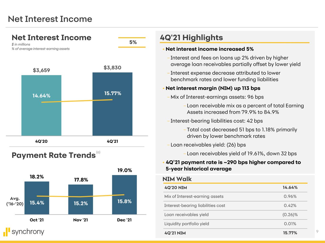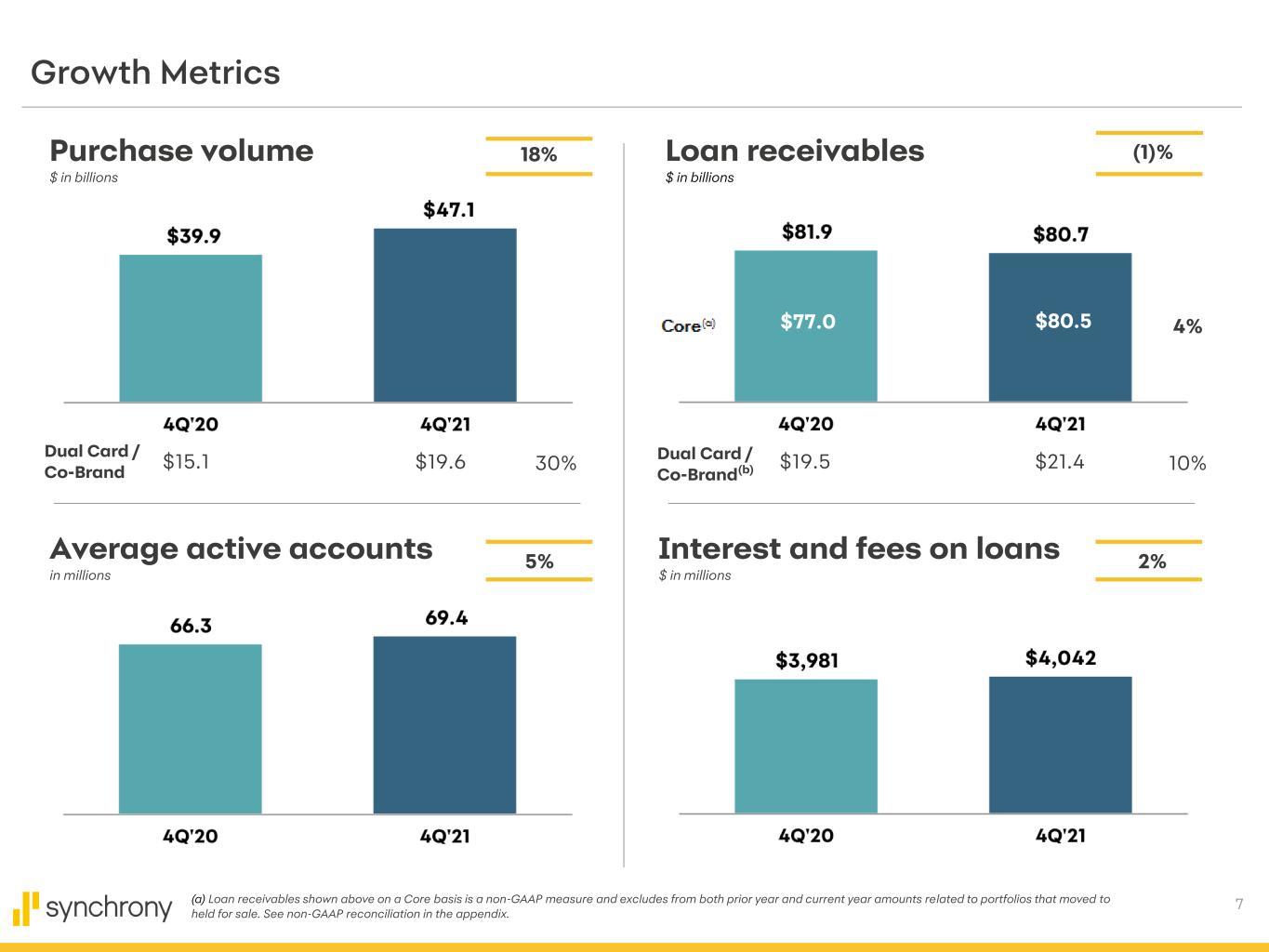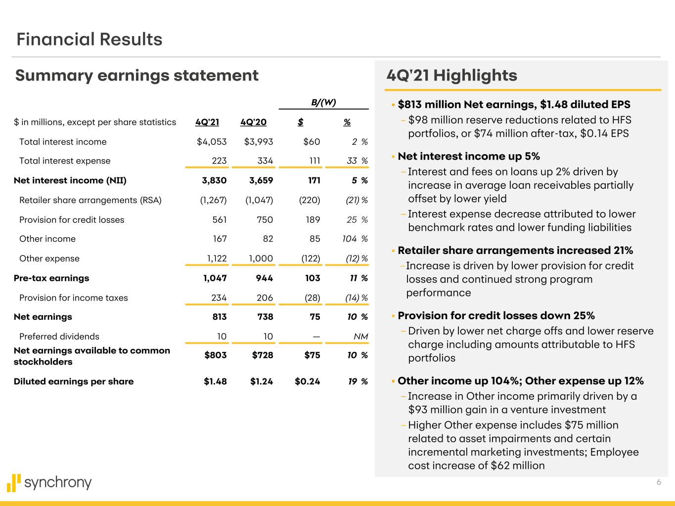 2 Cautionary Statement Regarding Forward-Looking Statements The following slides are part of a presentation by Synchrony Financial in connection with reporting quarterly financial results. No representation is made that the information in these slides is complete. For additional information, see the earnings release and financial supplement included as exhibits to our Current Report on Form 8-K filed today and available on our website (www.synchronyfinancial.com) and the SEC's website (www.sec.gov). All references to net earnings and net income are intended to have the same meaning. All comparisons are for the fourth quarter of 2021 compared to the fourth quarter of 2020, unless otherwise noted. This presentation contains certain forward-looking statements as defined in Section 27A of the Securities Act of 1933, as amended, and Section 21E of the Securities Exchange Act of 1934, as amended, which are subject to the "safe harbor" created by those sections. Forward-looking statements may be identified by words such as "expects," "intends," "anticipates," "plans," "believes," "seeks," "targets," "outlook," "estimates," "will," "should," "may" or words of similar meaning, but these words are not the exclusive means of identifying forward-looking statements. Forward- looking statements are based on management's current expectations and assumptions, and are subject to inherent uncertainties, risks and changes in circumstances that are difficult to predict. As a result, actual results could differ materially from those indicated in these forward-looking statements. Factors that could cause actual results to differ materially include global political, economic, business, competitive, market, regulatory and other factors and risks, such as: the impact of macroeconomic conditions and whether industry trends we have identified develop as anticipated, including the future impacts of the novel coronavirus disease (“COVID-19”) outbreak and measures taken in response thereto for which future developments are highly uncertain and difficult to predict; retaining existing partners and attracting new partners, concentration of our revenue in a small number of partners, and promotion and support of our products by our partners; cyber-attacks or other security breaches; disruptions in the operations of our and our outsourced partners' computer systems and data centers; the financial performance of our partners; the sufficiency of our allowance for credit losses and the accuracy of the assumptions or estimates used in preparing our financial statements, including those related to the CECL accounting guidance; higher borrowing costs and adverse financial market conditions impacting our funding and liquidity, and any reduction in our credit ratings; our ability to grow our deposits in the future; damage to our reputation; our ability to securitize our loan receivables, occurrence of an early amortization of our securitization facilities, loss of the right to service or sub-service our securitized loan receivables, and lower payment rates on our securitized loan receivables; changes in market interest rates and the impact of any margin compression; effectiveness of our risk management processes and procedures, reliance on models which may be inaccurate or misinterpreted, our ability to manage our credit risk; our ability to offset increases in our costs in retailer share arrangements; competition in the consumer finance industry; our concentration in the U.S. consumer credit market; our ability to successfully develop and commercialize new or enhanced products and services; our ability to realize the value of acquisitions and strategic investments; reductions in interchange fees; fraudulent activity; failure of third-parties to provide various services that are important to our operations; international risks and compliance and regulatory risks and costs associated with international operations; alleged infringement of intellectual property rights of others and our ability to protect our intellectual property; litigation and regulatory actions; our ability to attract, retain and motivate key officers and employees; tax legislation initiatives or challenges to our tax positions and/or interpretations, and state sales tax rules and regulations; regulation, supervision, examination and enforcement of our business by governmental authorities, the impact of the Dodd-Frank Wall Street Reform and Consumer Protection Act (the “Dodd-Frank Act”) and other legislative and regulatory developments and the impact of the Consumer Financial Protection Bureau’s (the “CFPB”) regulation of our business; impact of capital adequacy rules and liquidity requirements; restrictions that limit our ability to pay dividends and repurchase our common stock, and restrictions that limit the Bank’s ability to pay dividends to us; regulations relating to privacy, information security and data protection; use of third-party vendors and ongoing third-party business relationships; and failure to comply with anti-money laundering and anti-terrorism financing laws. For the reasons described above, we caution you against relying on any forward-looking statements, which should also be read in conjunction with the other cautionary statements that are included elsewhere in this presentation and in our public filings, including under the heading “Risk Factors Relating to Our Business” and “Risk Factors Relating to Regulation” in the Company's Annual Report on Form 10-K for the fiscal year ended December 31, 2020, as filed on February 11, 2021. You should not consider any list of such factors to be an exhaustive statement of all the risks, uncertainties, or potentially inaccurate assumptions that could cause our current expectations or beliefs to change. Further, any forward-looking statement speaks only as of the date on which it is made, and we undertake no obligation to update or revise any forward-looking statement to reflect e