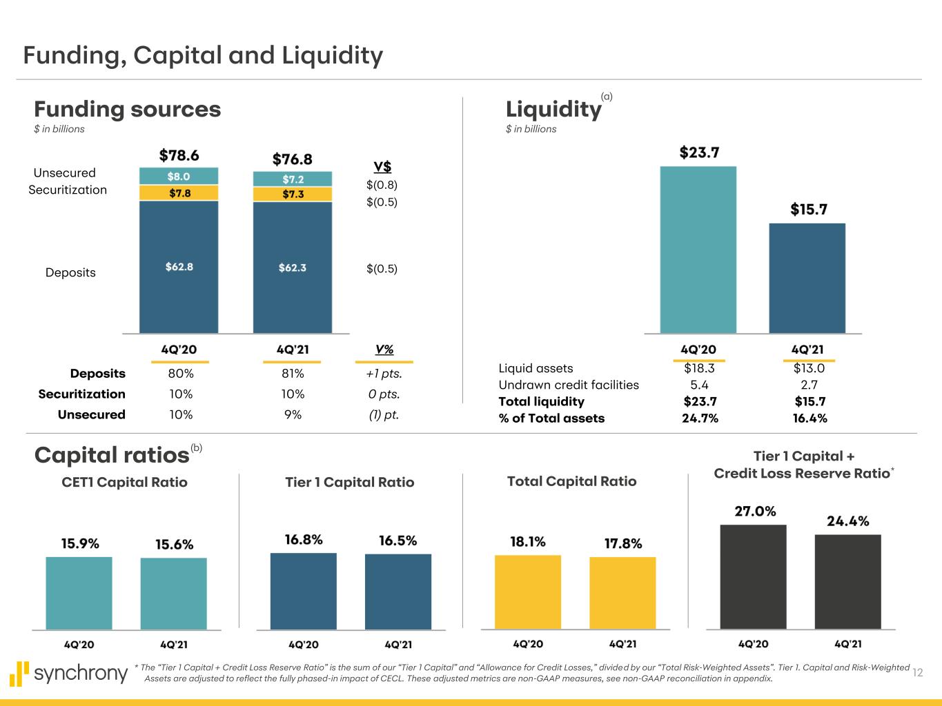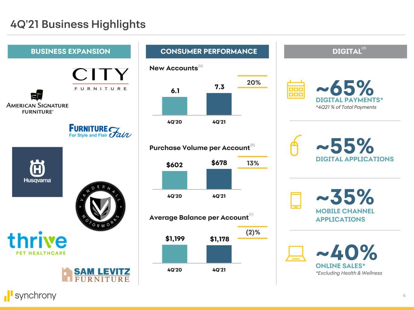 3 $1.48 DILUTED EPS compared to $1.24; $0.14 increase from reserve reductions for HFS portfolios 15.77% NET INTEREST MARGIN compared to 14.64% 15.6% CET1 liquid assets of $13.0 billion, 13.6% of total assets SUMMARY FINANCIAL METRICS CAPITAL 4Q'21 Financial Highlights $85.1 billion LOANS Includes $80.7 billion Loan Receivables and $4.4 billion HFS compared to $81.9 billion $62.3 billion DEPOSITS 81% of current funding 2.37% NET CHARGE-OFFS compared to 3.16% 69.4 million AVERAGE ACTIVE ACCOUNTS compared to 66.3 million $1.1 billion CAPITAL RETURNED YTD returned $3.4 billion; $2.9 billion share repurchases 41.1% EFFICIENCY RATIO compared to 37.1%