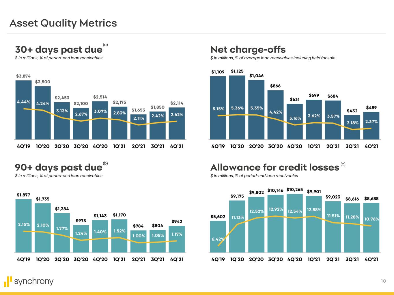 9 Net Interest Income Net Interest Income $ in millions % of average interest-earning assets • Net interest income increased 5% – Interest and fees on loans up 2% driven by higher average loan receivables partially offset by lower yield – Interest expense decrease attributed to lower benchmark rates and lower funding liabilities • Net interest margin (NIM) up 113 bps – Mix of Interest-earnings assets: 96 bps – Loan receivable mix as a percent of total Earning Assets increased from 79.9% to 84.9% – Interest-bearing liabilities cost: 42 bps – Total cost decreased 51 bps to 1.18% primarily driven by lower benchmark rates – Loan receivables yield: (26) bps – Loan receivables yield of 19.61%, down 32 bps • 4Q’21 payment rate is ~290 bps higher compared to 5-year historical average 4Q'21 Highlights 4Q'20 NIM 14.64% Mix of Interest-earning assets 0.96% Interest-bearing liabilities cost 0.42% Loan receivables yield (0.26)% Liquidity portfolio yield 0.01% 4Q'21 NIM 15.77% NIM Walk Payment Rate Trends (a) 5% Avg. (‘16-‘20)