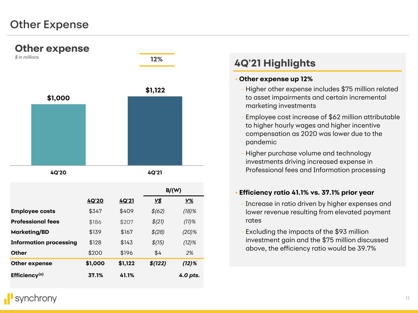 11 B/(W) 4Q'20 4Q'21 V$ V% Employee costs $347 $409 $(62) (18)% Professional fees $186 $207 $(21) (11)% Marketing/BD $139 $167 $(28) (20)% Information processing $128 $143 $(15) (12)% Other $200 $196 $4 2% Other expense $1,000 $1,122 $(122) (12)% Efficiency(a) 37.1% 41.1% 4.0 pts. Other Expense Other expense $ in millions 4Q'21 Highlights12% • Other expense up 12% – Higher other expense includes $75 million related to asset impairments and certain incremental marketing investments – Employee cost increase of $62 million attributable to higher hourly wages and higher incentive compensation as 2020 was lower due to the pandemic – Higher purchase volume and technology investments driving increased expense in Professional fees and Information processing • Efficiency ratio 41.1% vs. 37.1% prior year – Increase in ratio driven by higher expenses and lower revenue resulting from elevated payment rates – Excluding the impacts of the $93 million investment gain and the $75 million discussed above, the efficiency ratio would be 39.7%