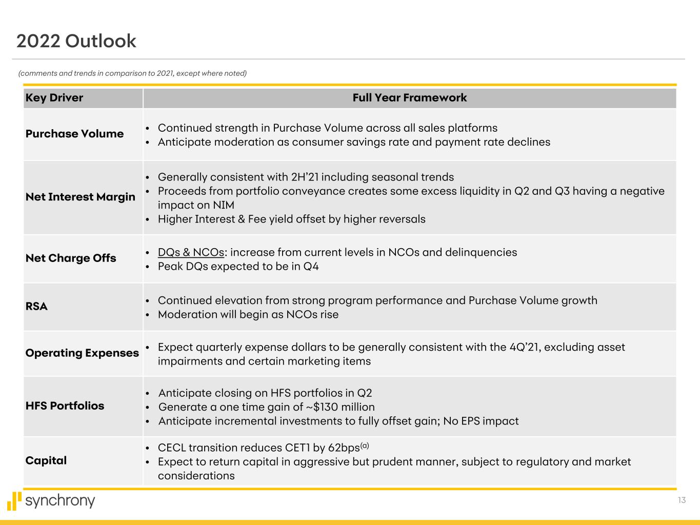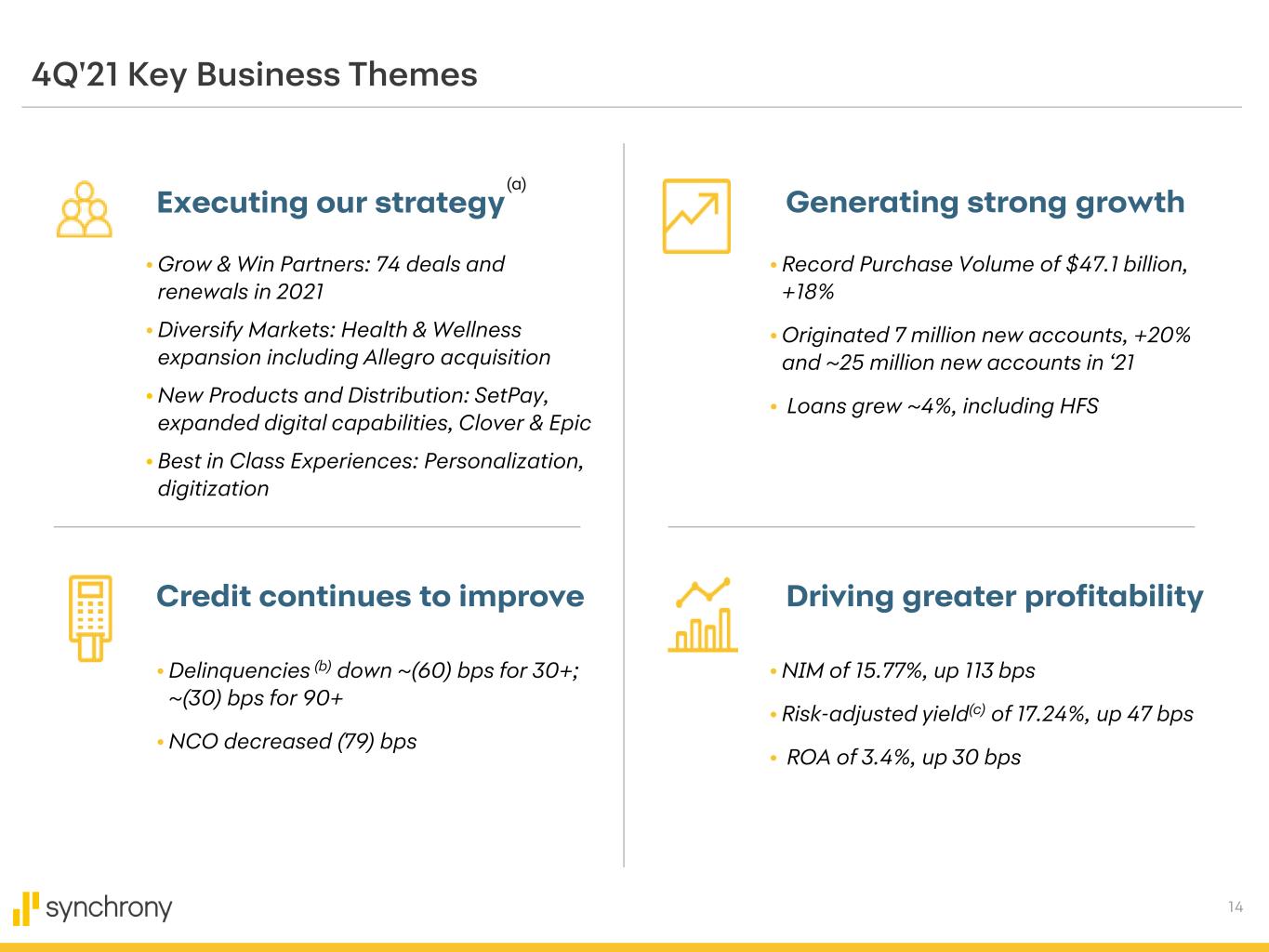 13 2022 Outlook Key Driver Full Year Framework Purchase Volume • Continued strength in Purchase Volume across all sales platforms • Anticipate moderation as consumer savings rate and payment rate declines Net Interest Margin • Generally consistent with 2H’21 including seasonal trends • Proceeds from portfolio conveyance creates some excess liquidity in Q2 and Q3 having a negative impact on NIM • Higher Interest & Fee yield offset by higher reversals Net Charge Offs • DQs & NCOs: increase from current levels in NCOs and delinquencies • Peak DQs expected to be in Q4 RSA • Continued elevation from strong program performance and Purchase Volume growth • Moderation will begin as NCOs rise Operating Expenses • Expect quarterly expense dollars to be generally consistent with the 4Q’21, excluding asset impairments and certain marketing items HFS Portfolios • Anticipate closing on HFS portfolios in Q2 • Generate a one time gain of ~$130 million • Anticipate incremental investments to fully offset gain; No EPS impact Capital • CECL transition reduces CET1 by 62bps(a) • Expect to return capital in aggressive but prudent manner, subject to regulatory and market considerations (comments and trends in comparison to 2021, except where noted)